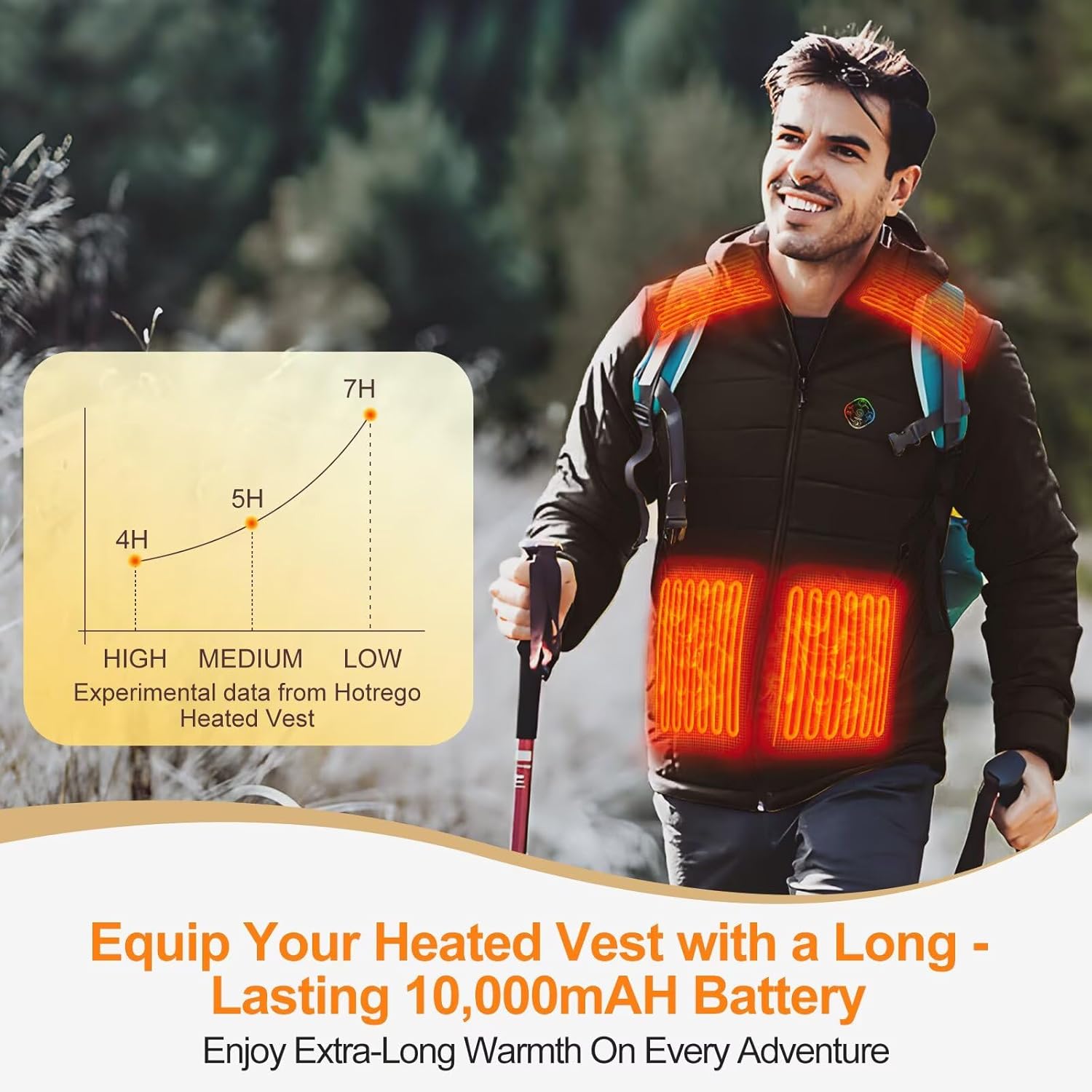 Large Capacity & Wide Compatibility:With a 10,000mAh large capacity, this power bank comes with a USB-C input port, a USB-A output port, and 4 power indicator lights for easy at-a-glance battery level checks anytime. Beyond providing 3-8 hours of warmth for heated vests, it can charge most smart devices: up to 2.5 charges for iPhone 15, over 18 charges for AirPods, and is also compatible with tablets, smart watches, game consoles, portable fans, and other small electronics