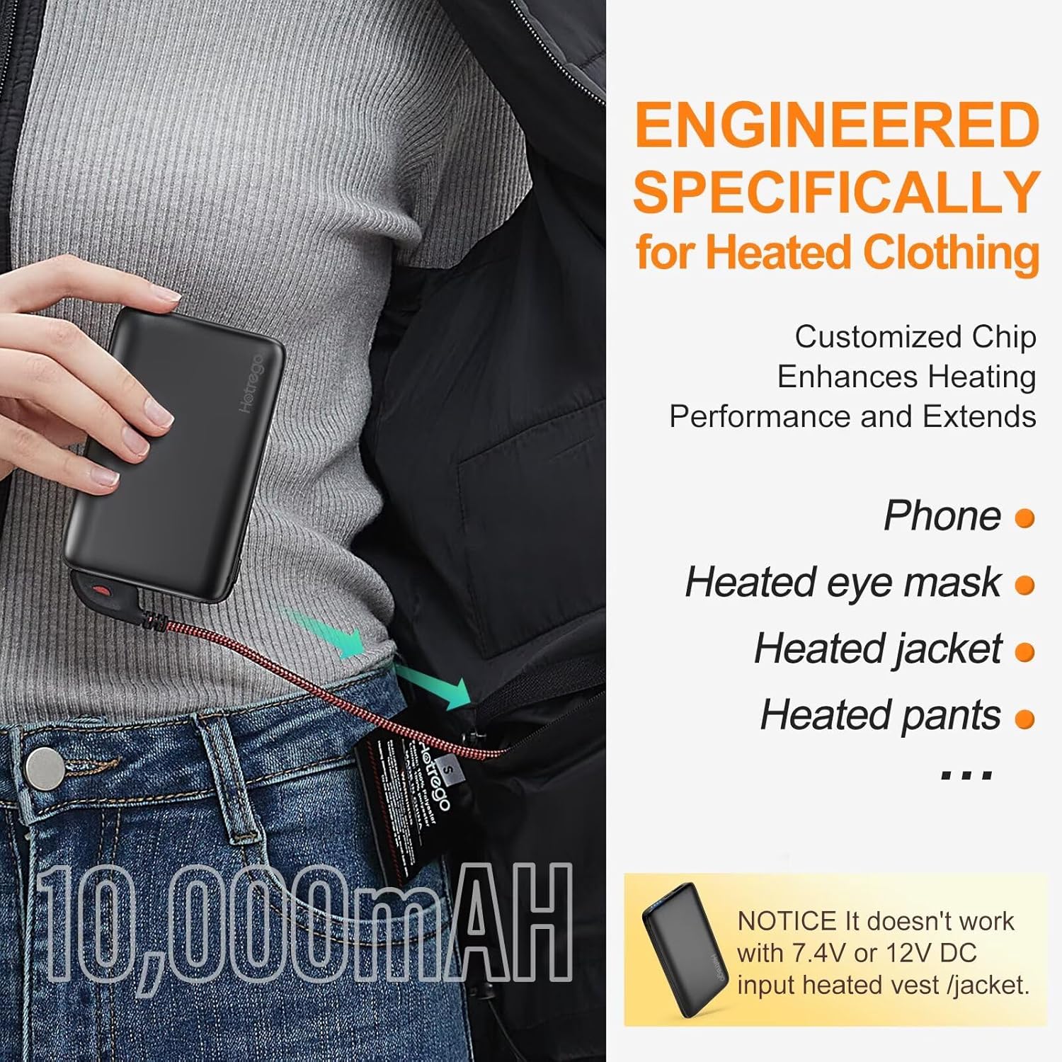 Designed for Heated Vest/Jacket:Our Hotrego 5V2A 10,000 mah heated vest battery pack is suitable for heated vests, jackets, pants, and socks and other heated garments with 5V/2A input USB port. Heated jacket battery pack providing continuous and stable output for the heated garments and activates automatically on connection for instant warmth, and enters sleep mode when idle to save energy. Note: Not compatible with 7.4V/12V DC input heated coat