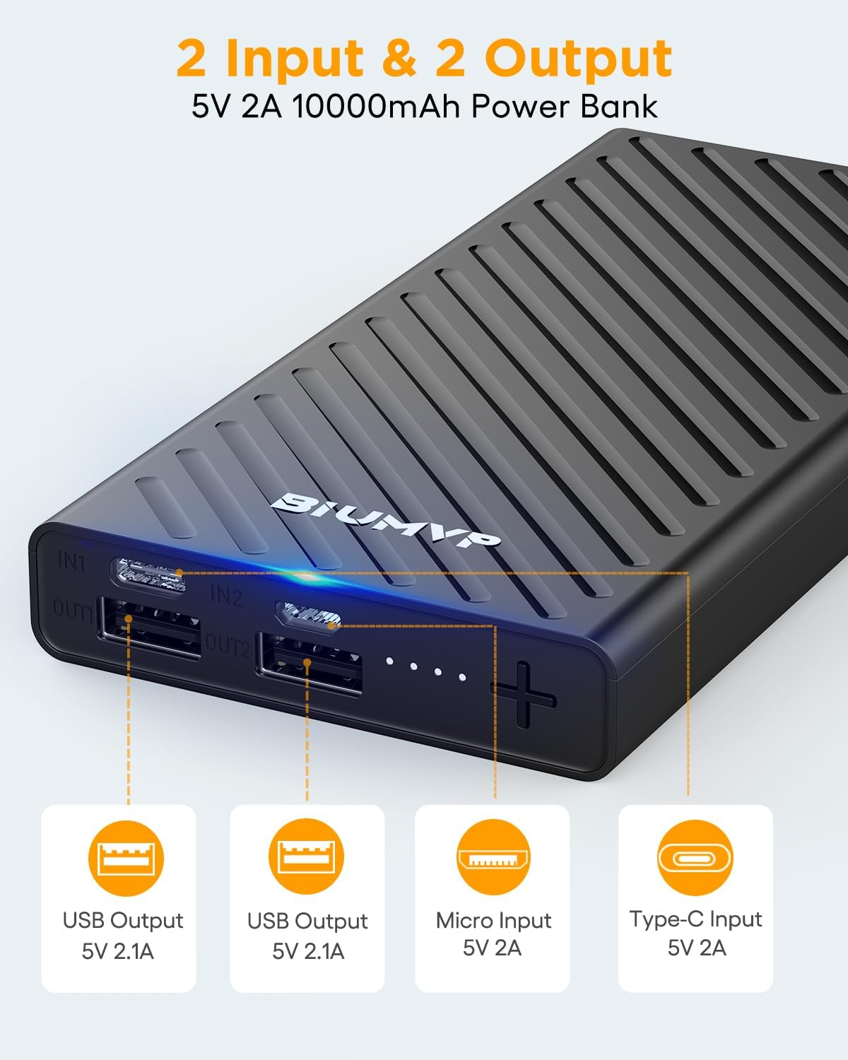 【Dual output Power Bank】There are Type-C and Micro dual input (5V/2.1A), and 2 USB output Ports that can charge two devices at the same time which you can share them with friends.