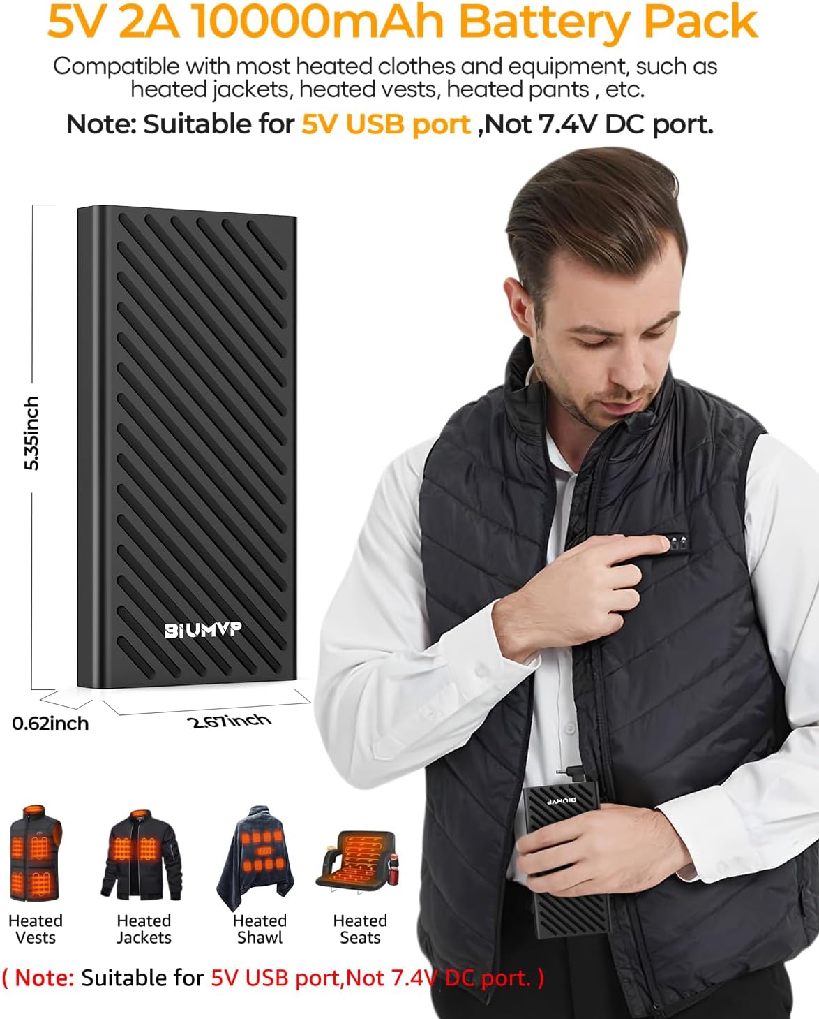 【NOTICE】Suitable for 5V USB port ,Not 7.4V/12V DC port. Please confirm that the heated vest/jacket is a USB port before purchasing.