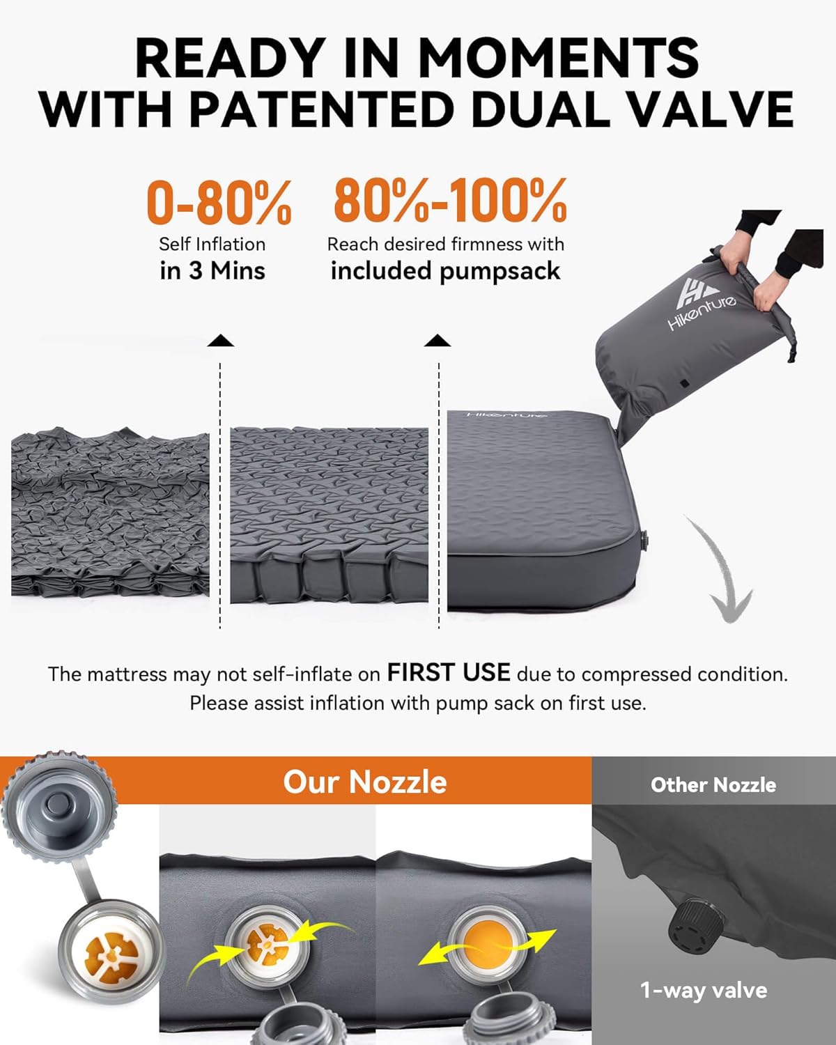WHISPER-QUIET NIGHTS UNDER STARS – Our 2 person sleeping pad with stretch-knit fabric surface combines whisper-soft comfort with noise-free movement. No more crinkly plastic sounds ruining your wilderness zen! Roll over freely without waking tent mates – Our camping mat is ideal for light sleepers and family camping trips where peaceful sleep matters most.