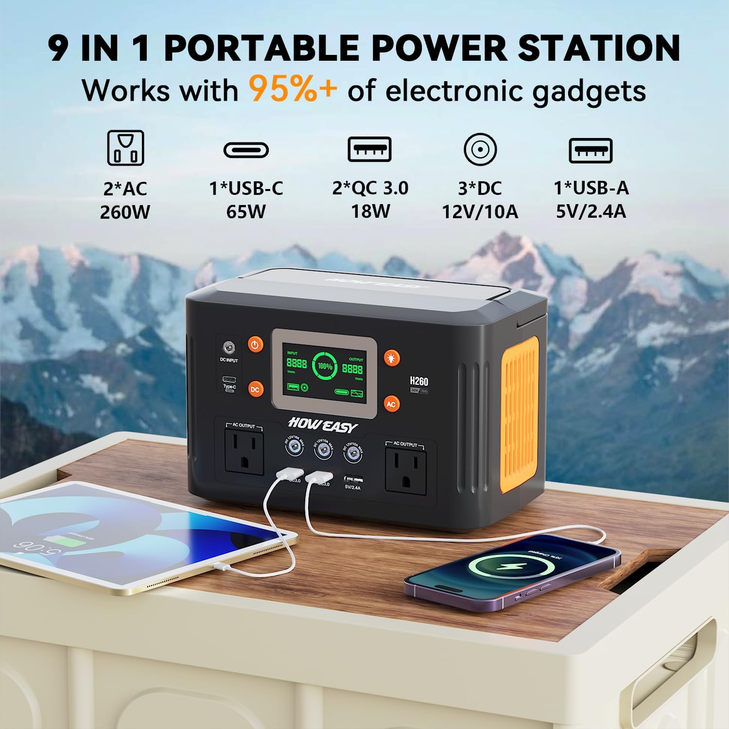 9 multifunction ports:The portable power station features nine versatile output ports to power all essential devices: two AC outlets (260W, 500W peak), one 65W fast-charging Type-C port, three USB-A ports, and three DC ports. This power station reliably charges smartphones, laptops, drones, CPAP machines, cameras, and more anytime, anywhere.