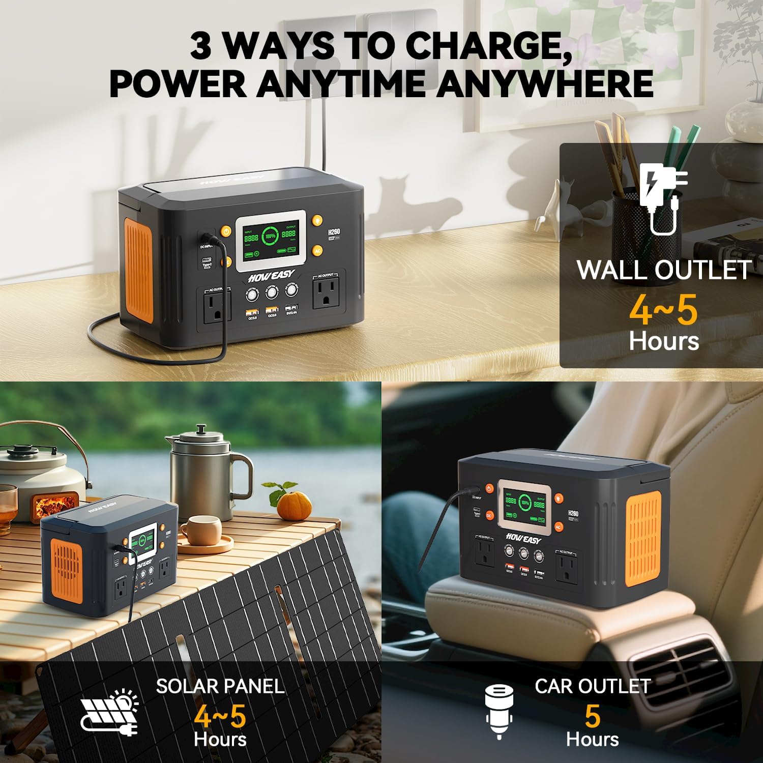 Triple Charging Modes: This portable generator offers three flexible charging options: via solar panels (18-24V), AC wall adapter, or car charger. Its advanced lithium battery ensures stable performance without memory effect, providing long-term reliable power for your outdoor adventures or emergency backup needs.