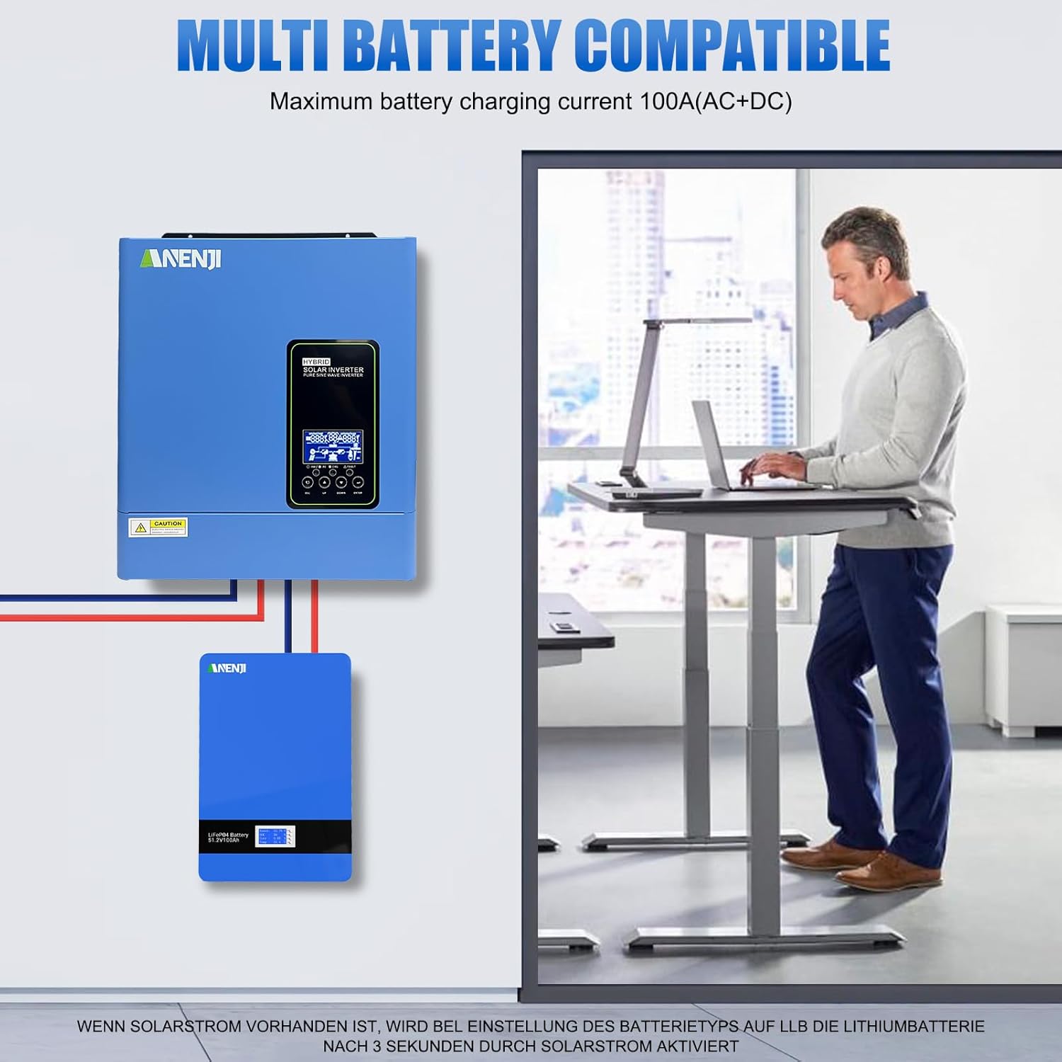【No-Battery Operation & Li-ion Battery Compatibility】No-Battery Mode supports grid-tied operation relying on PV or utility power. With RS485 protocol, it auto-syncs with PYLON US2000 batteries for real-time SOC and charge-discharge limits display. For non-communicating Li-ion batteries, user-defined settings prevent BMS conflicts.