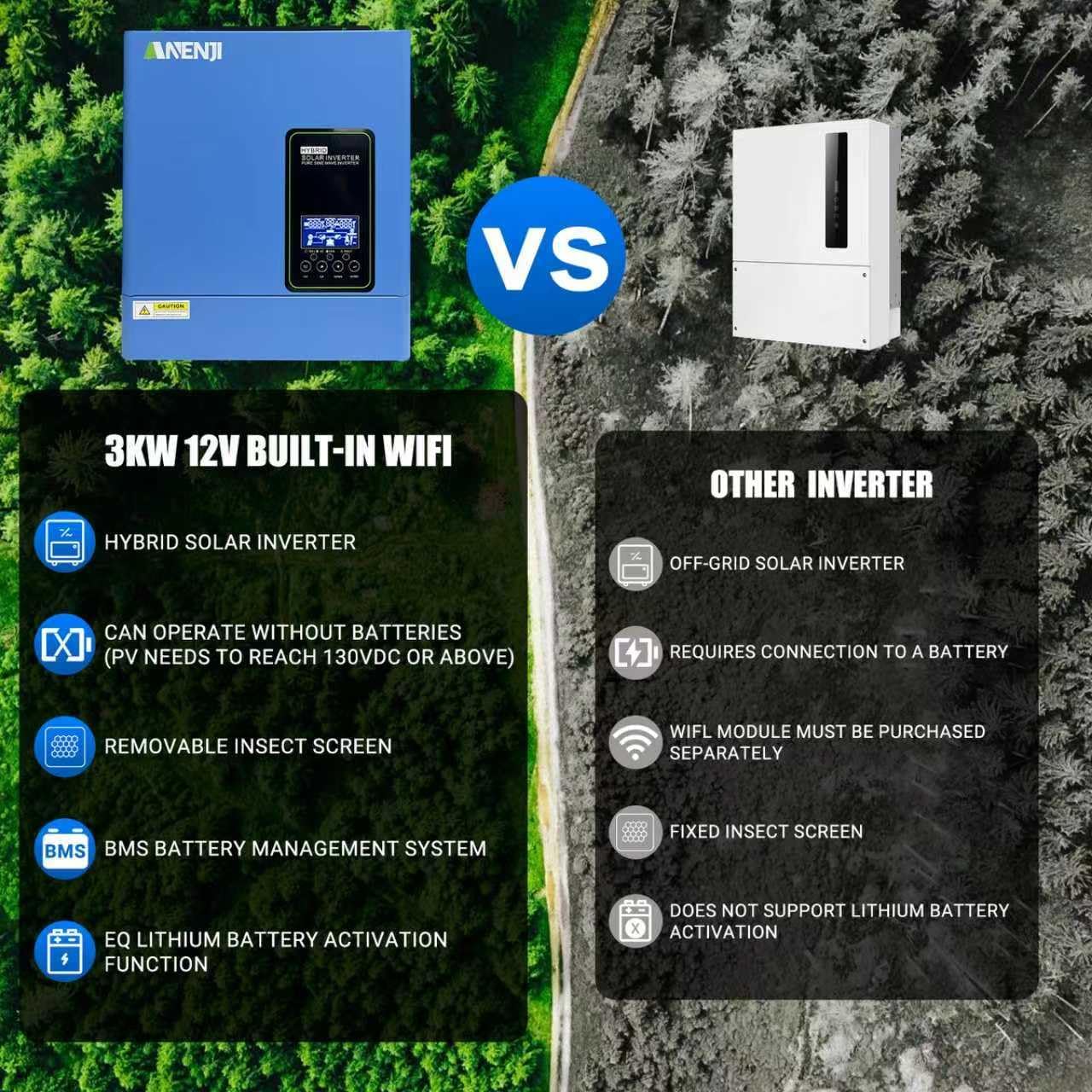 【Built-in WiFi for Remote Monitoring】Includes WiFi connectivity for real-time tracking of power usage, PV input, and battery status via the SmartESS app. Adjust settings remotely (e.g., output priority, charging current) and receive fault alerts (e.g., overload, high temp), reducing troubleshooting time.