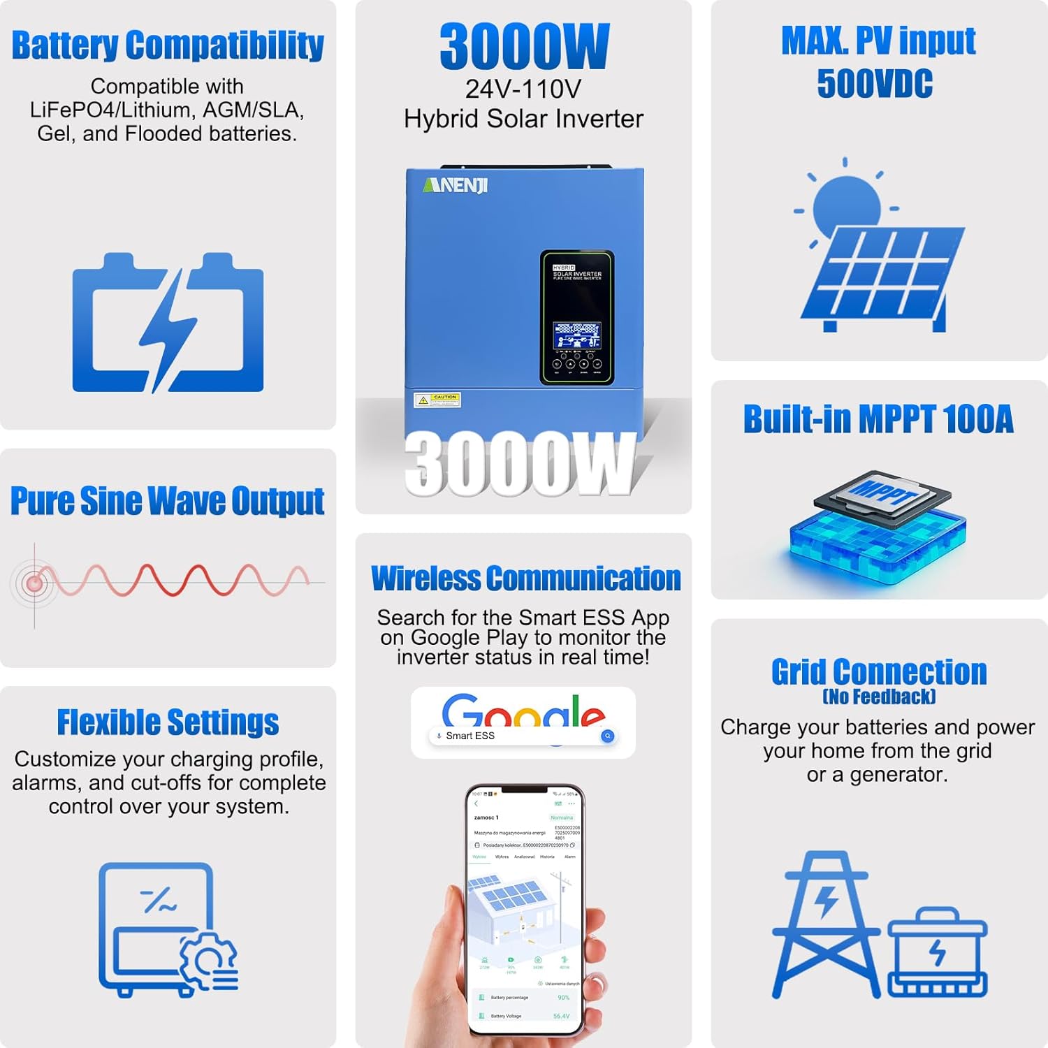 Hybrid Solar Inverter 3000W, 24Vdc to110Vac Off-Grid Inverter,100A MPPT Controller,Support Battery-Less or AGM Lithium Battery, Pure Sine Wave for Home Backup,Solar Systems