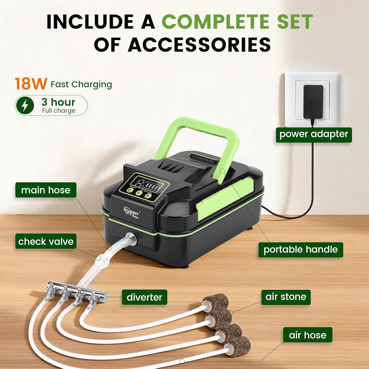 Aquarium Aeration Complete Kit: Comes with all the accessories you need to get started (main hose, air stones, air tube, 4-hole manifold, check valve, charger)