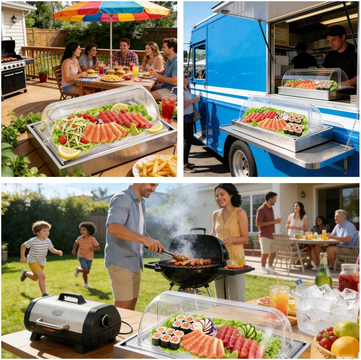【Available Outdoor or Indoor】 The size is 21x13x9.8inch (54x34x25cm). This food serving cooler without electricity. It is cost-effective and environmental. It is convenient for outdoor buffet, parties, street vendors and also be used in indoor restaurants or markets to preserve seafood, sashimi, sushi, salad, fruit, vegetables and other dishes.