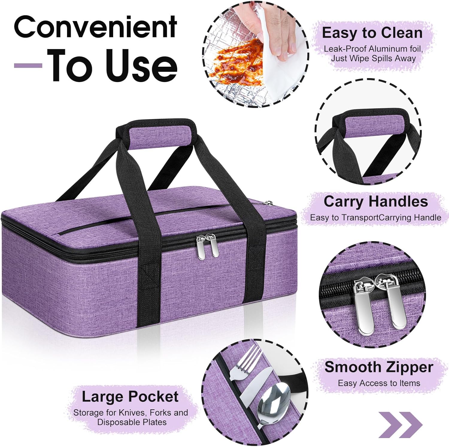 Details: The casserole dish carrier bag adopt double zipper design, easy to open and close; The internal aluminum film not only holds heat but easy wiped clean with paper towels when encountering dirt; Note: Not machine washable