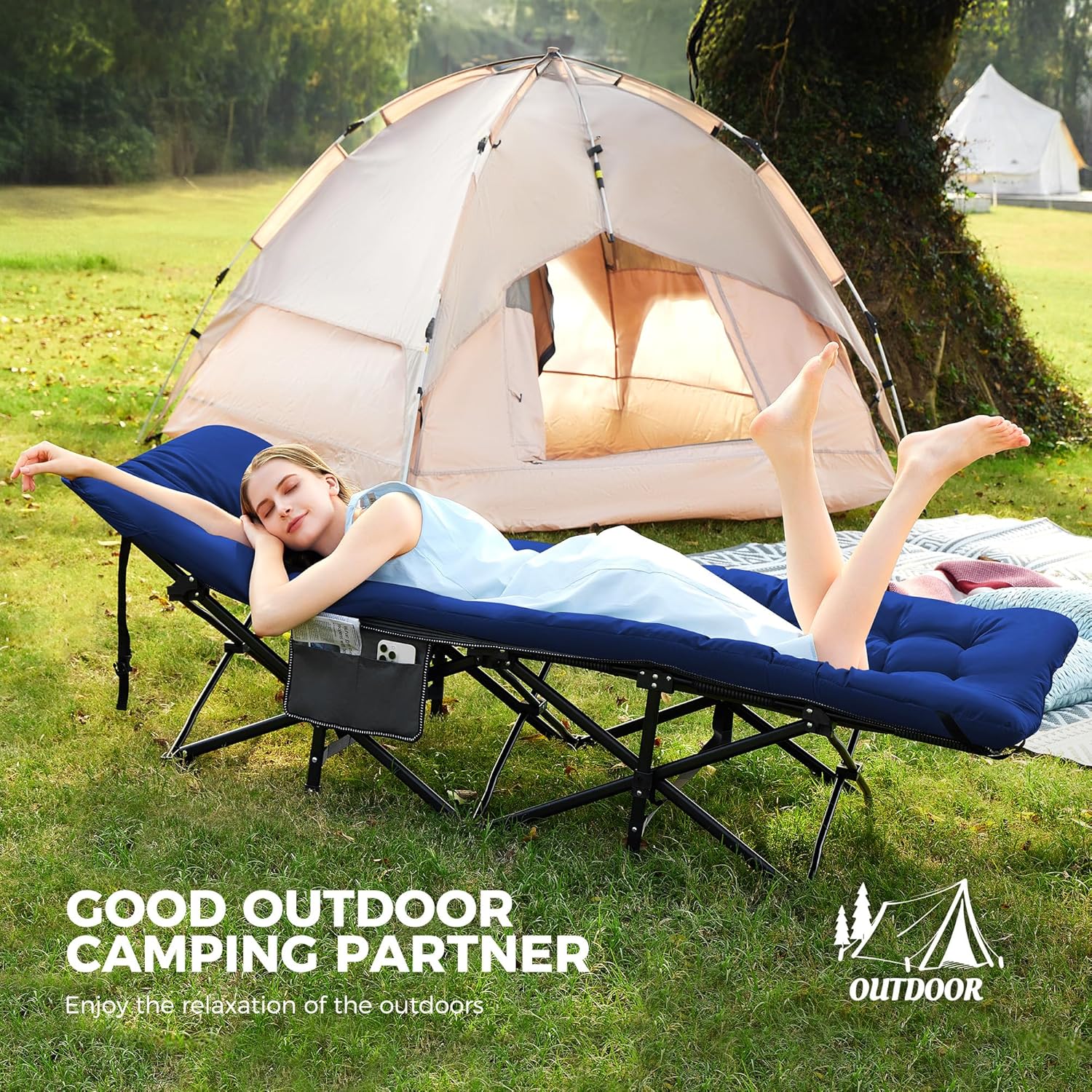 【DETACHABLE THICKENED PAD】: Camping bed equipped with a high-density cotton mattress that is comfortable, pressure-resistant and keeps its shape without deformation. Removable mattress, the breathable oxford fabric will immediately switch to cool mode in the summer