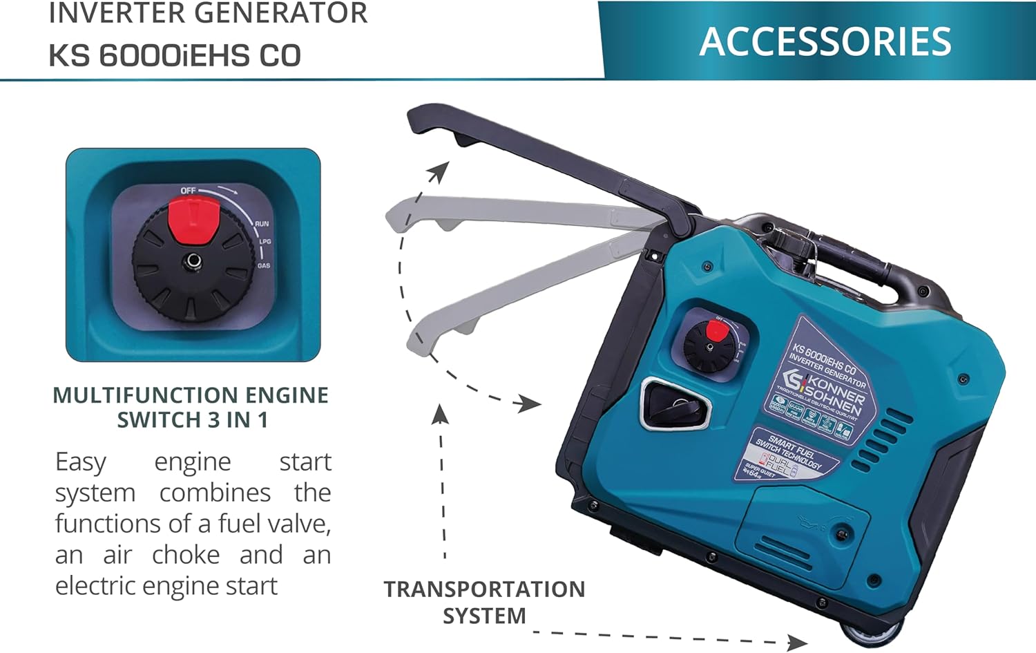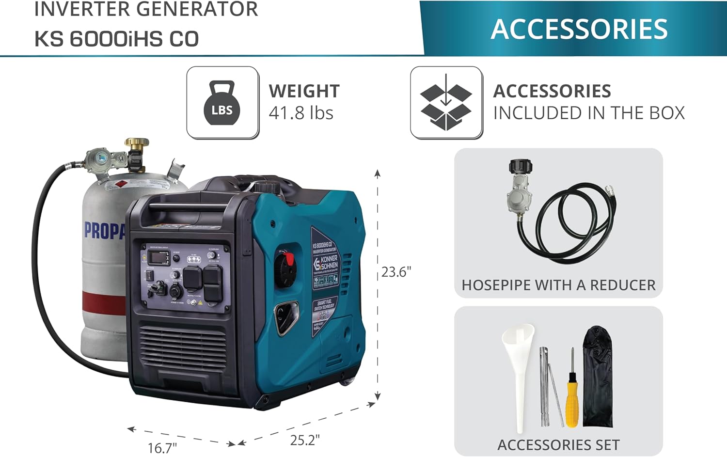 Konner&Sohnen Dual Fuel Inverter Generator – 5500W, 120/240V, Portable and Lightweight, Super Quiet with CO Sensor and Fuel-Efficient Technology, Gas & LPG Powered (German brand,model:KS 6000iEHS CO)