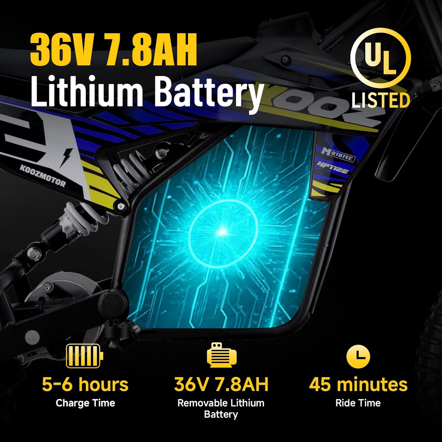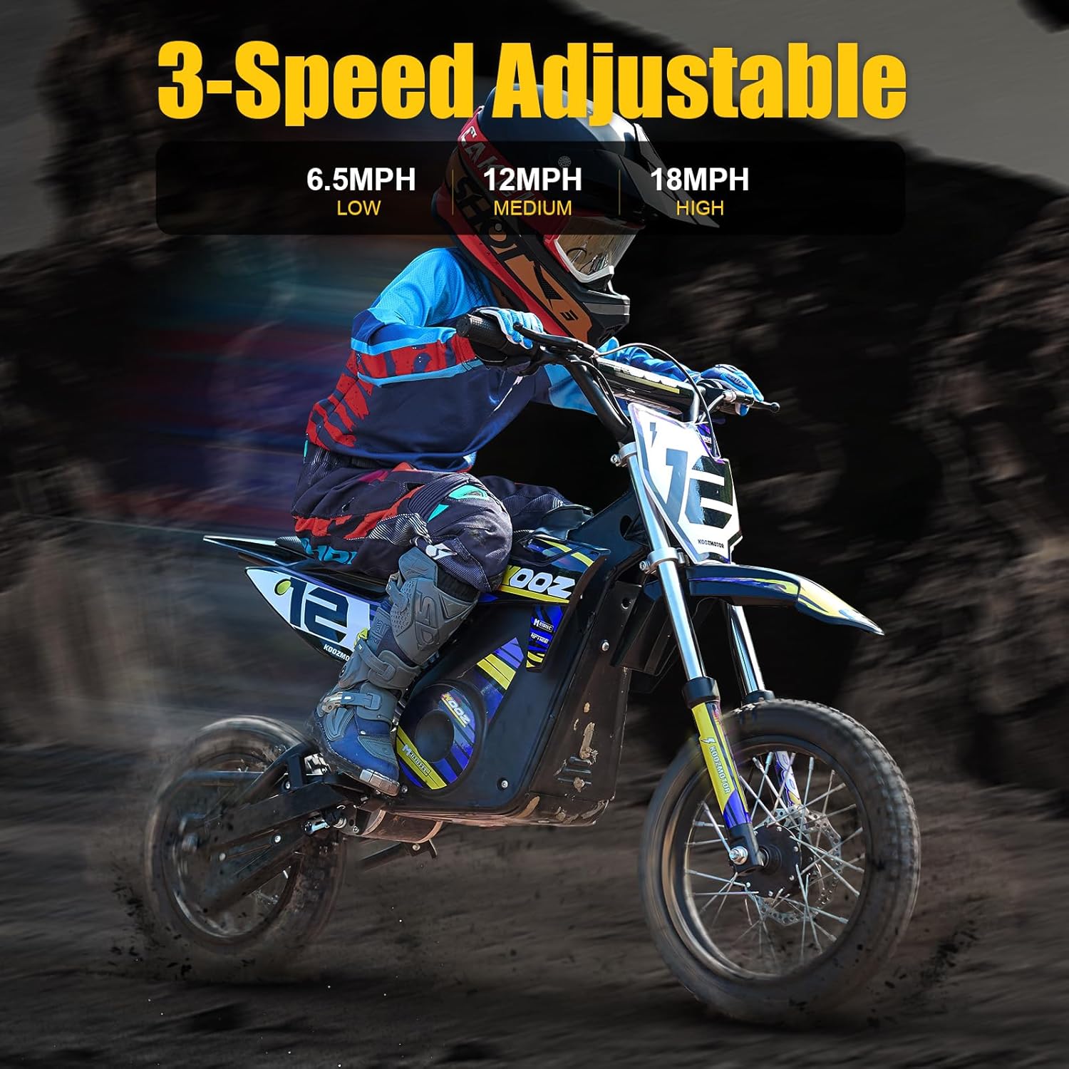 MODERN OFF-ROAD DESIGN: This dirt bike for teen features a unique and innovative design, highlighted by a vibrant mix of yellow, purple, and black accents. The eye-catching number “12” on the front panel adds to its sporty appeal. The Dirt Bike’s unique design makes you stand out anytime, anywhere you ride.