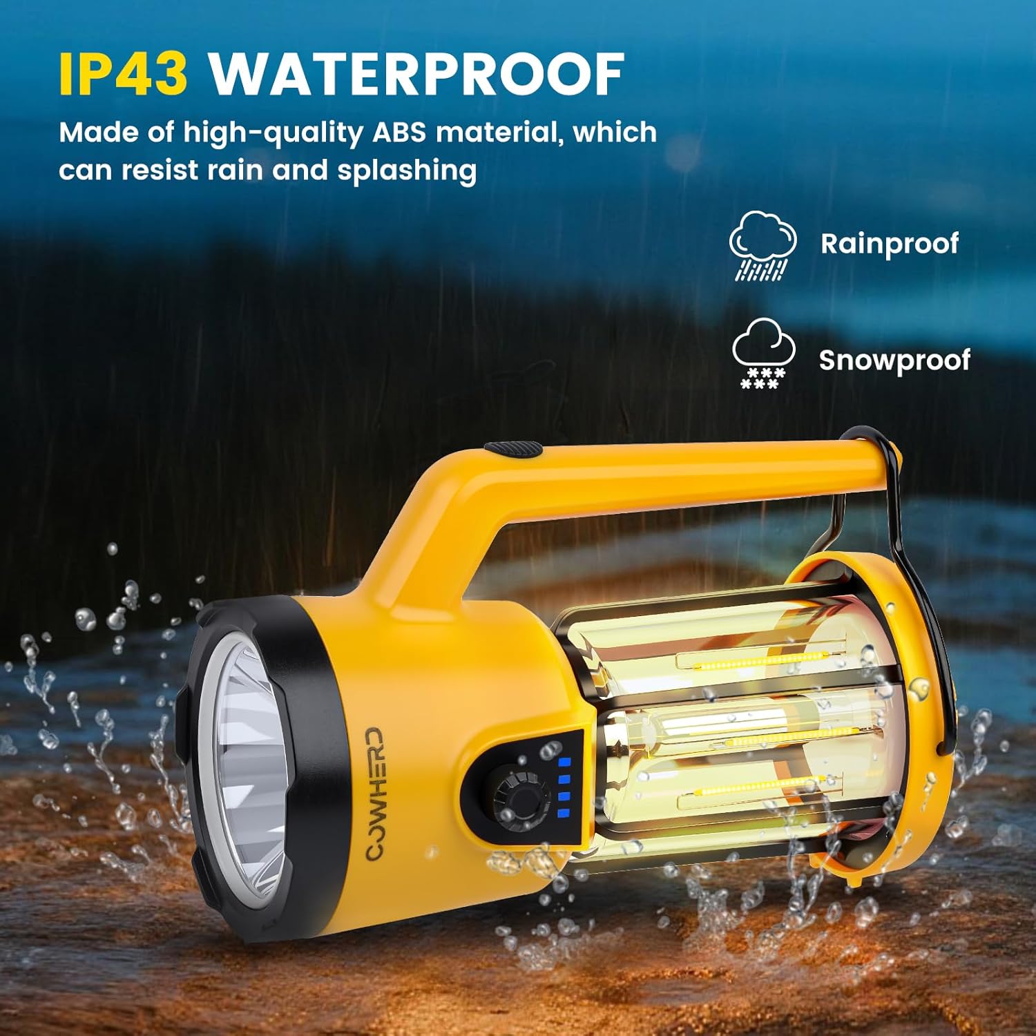 DURABLE & WEATHER-READY – Built with tough ABS material and rated IP43 waterproof, this rechargeable camping light is resistant to rain, splashes, and rugged outdoor conditions, ensuring reliable performance anywhere
