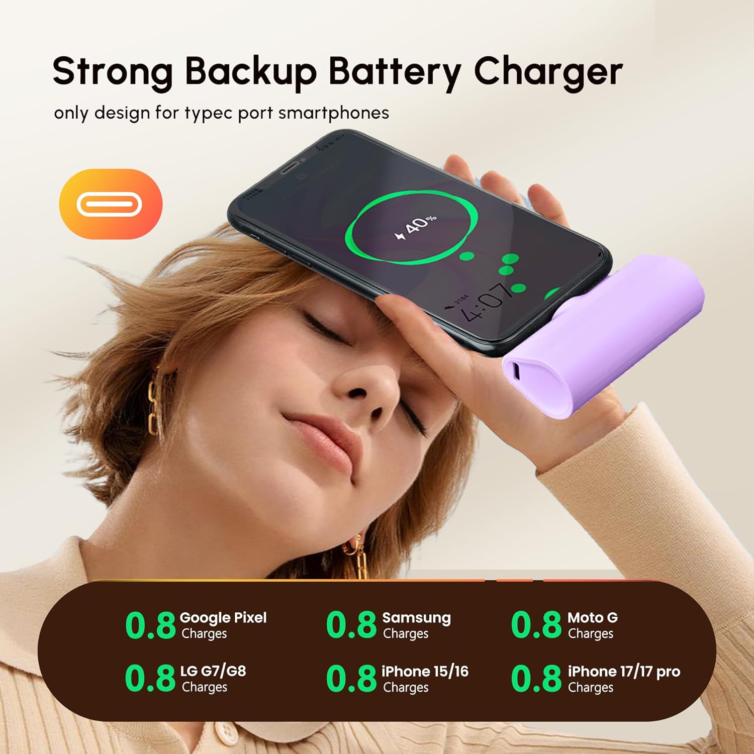 4800mah Emergency Portable Charger: Just small capacity but be a perferct backup power bank in daily life. Only plug into your phone’s usb c port, then the mini battery pack will charge you phone fully within 1-2 hours.(It depends on the phone’s battery level).