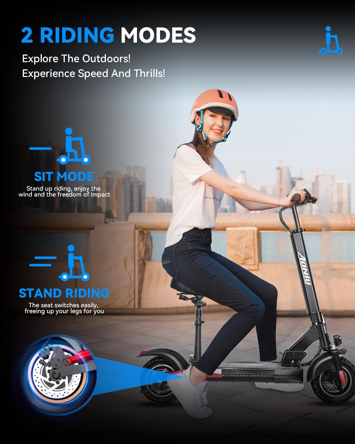 【2 Riding Modes & Portable Folding Design】With a removable seat and two riding modes, it’s easier to ride the way you like—sit or stand anytime.One-click lock, porbable folding mechanism can be carry it on other vehicle, for any destination you desire effortlessly.