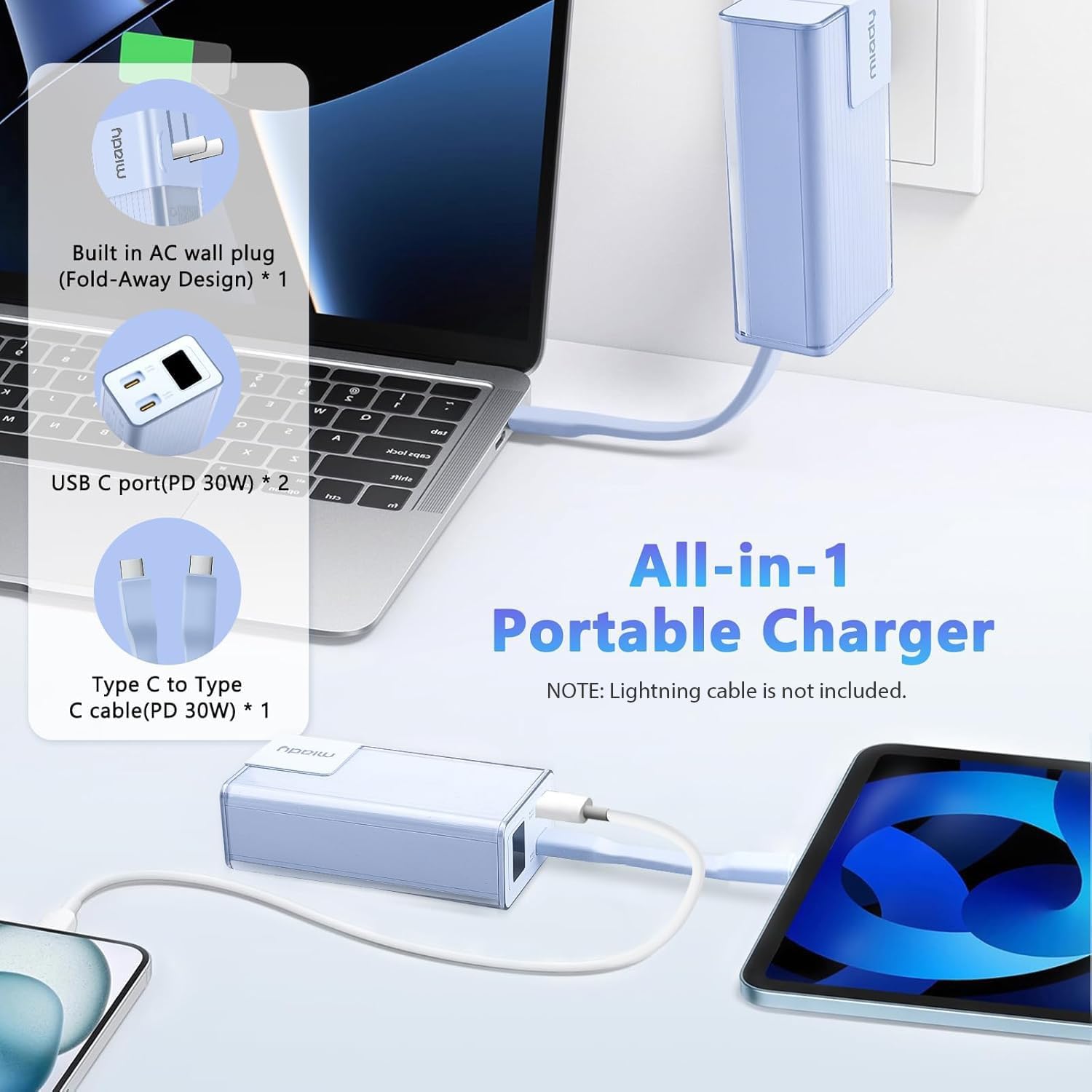What You Get: 10000mAh Portable Charger with built-in foldable AC plug (Cream Blue) * 1; USB-C Cable * 1; User Manual * 1. This phone battery bank comes with friendly customer 24/7 service. If you have any questions, please contact the Miady’s store first for a solution, we will be sure to provide a satisfying solution for you. Your satisfaction is our greatest recognition and support.
