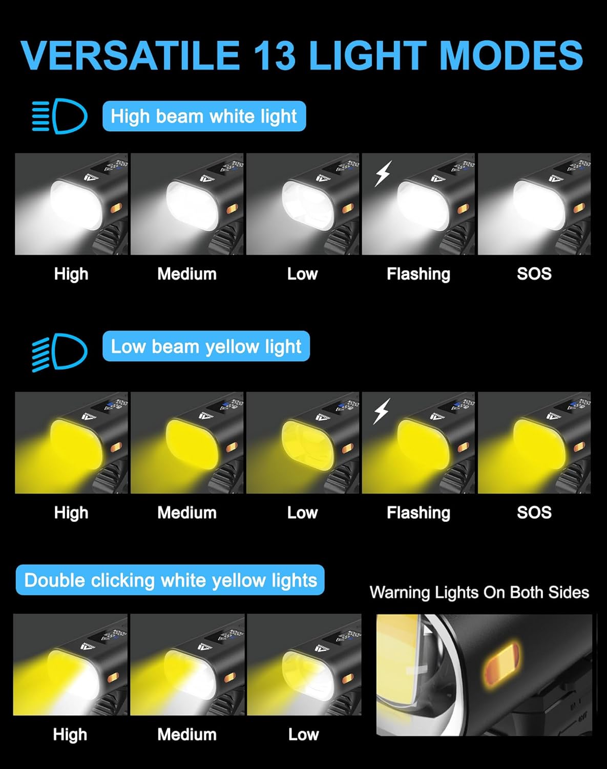Versatile Lighting 13 Modes: This bike light features 13 versatile modes: White Light(5 mode) , Yellow Light(5 modes) and Dual Light(3 modes). The bicycle light is also designed with warning lights on both sides. The light will change according to the lighting mode. Press and hold for 3 seconds in any mode to turn off the light for easy operation.