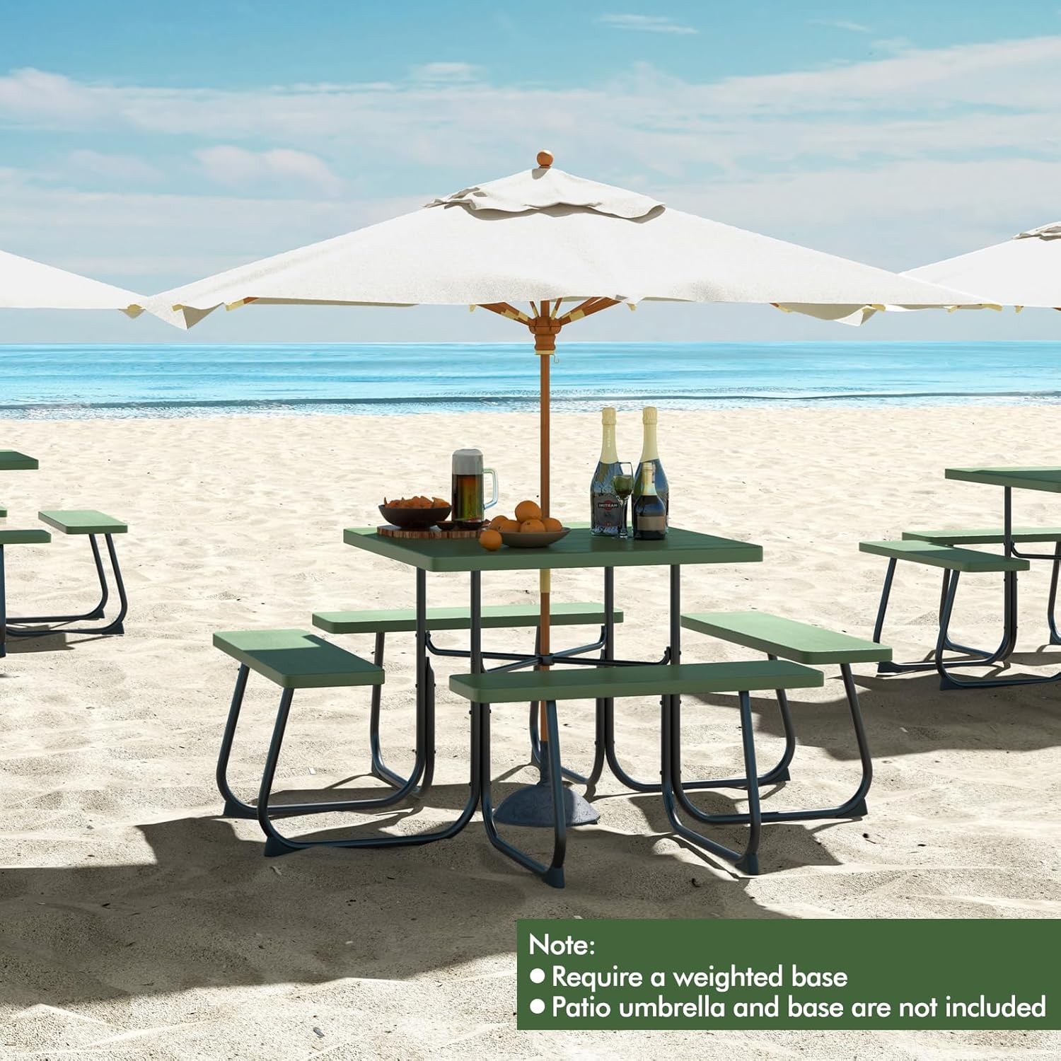 Moccha Picnic Table Bench Set – Outdoor Table and Chairs with Umbrella Hole, HDPE Tabletop & Metal Frame, 500LBS Capacity, Outdoor Camping Table for Garden Backyard Porch Patio Table Set (Green)