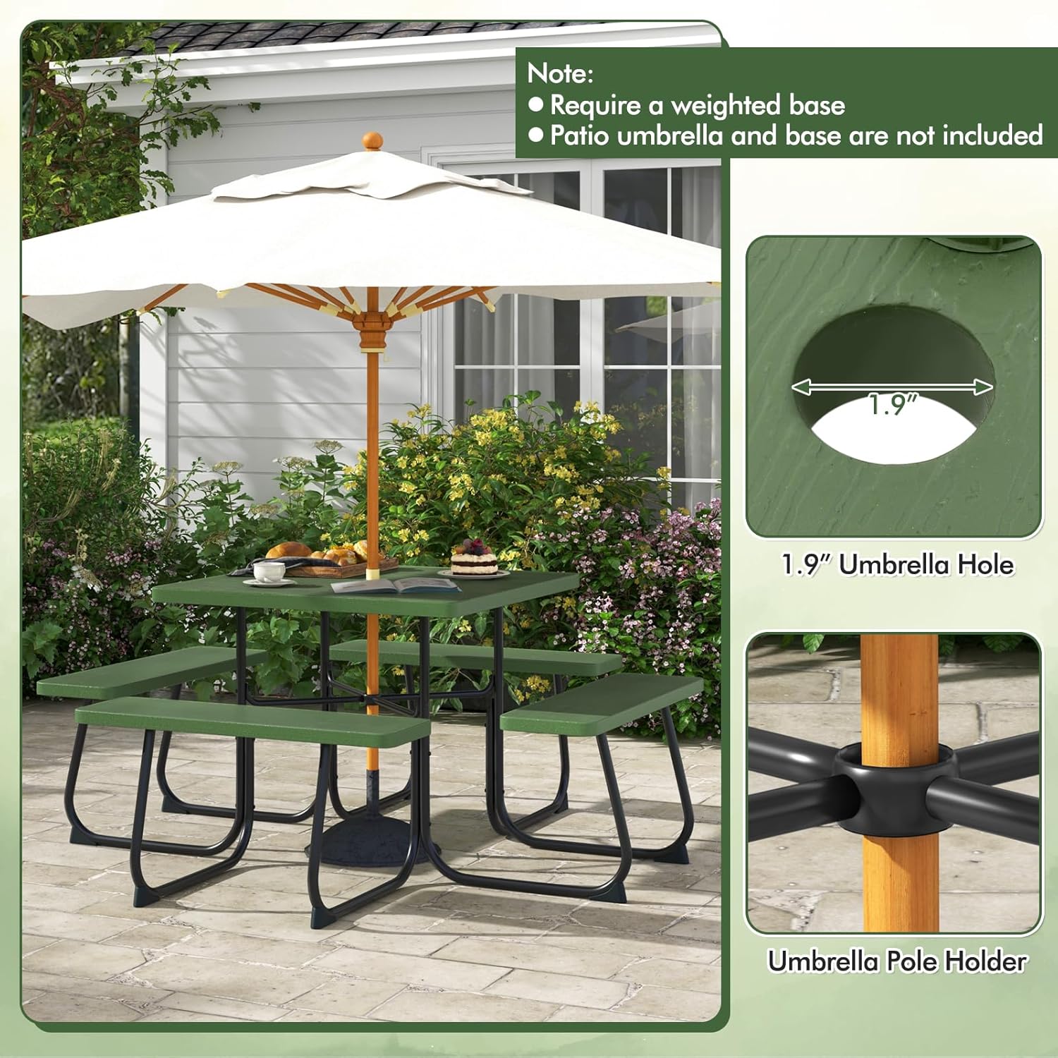 [Built-in Umbrella Hole]: This outdoor picnic table features a central umbrella hole with a 1.9-inch diameter and a secure bottom holder, making it easy to add a standard patio umbrella (not included) for comfortable shade.