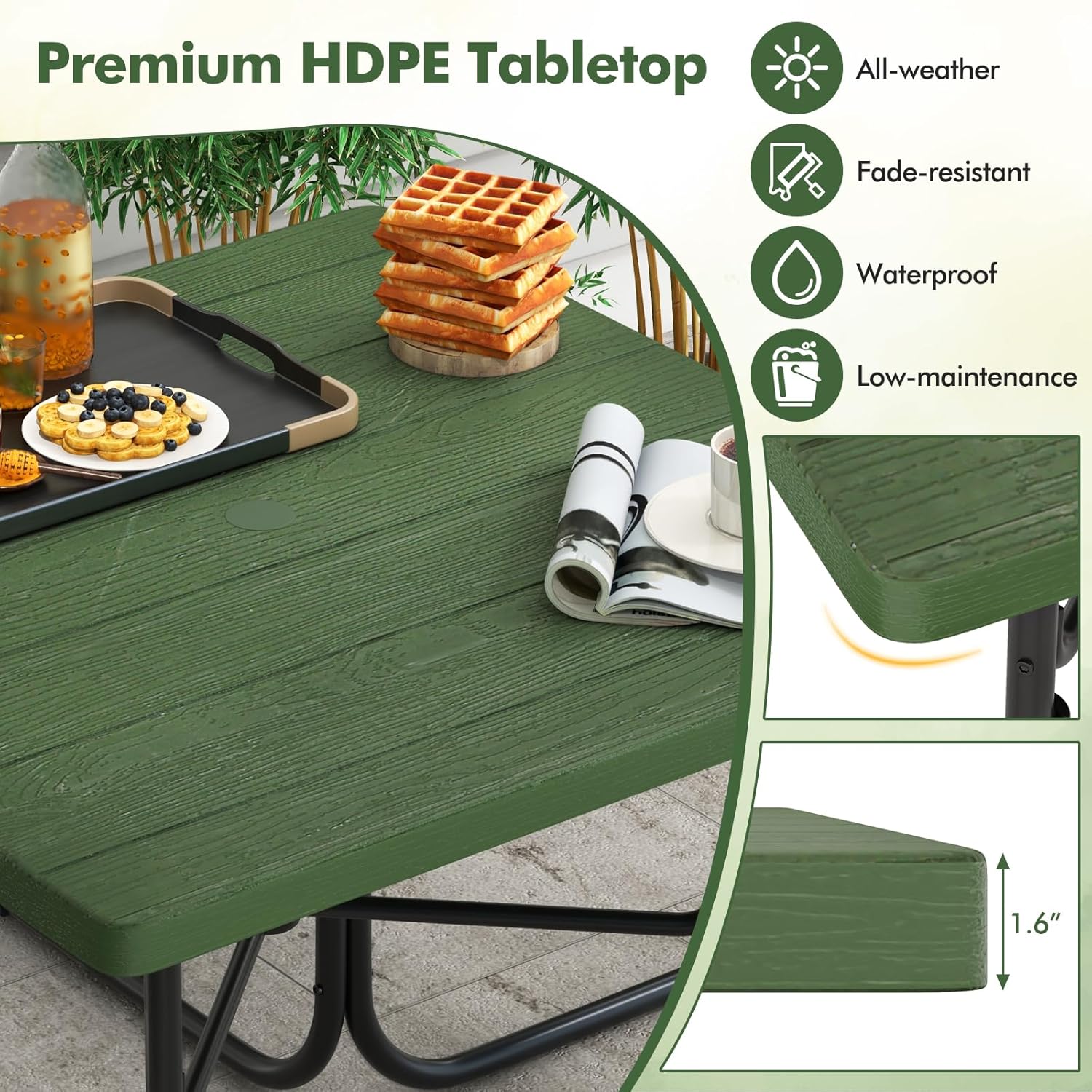 [Premium HDPE Material]: Crafted from HDPE material and supported by a sturdy metal frame, this picnic table is tough, anti-cracking, and provides sun protection, making it more stable for year-round outdoor use.