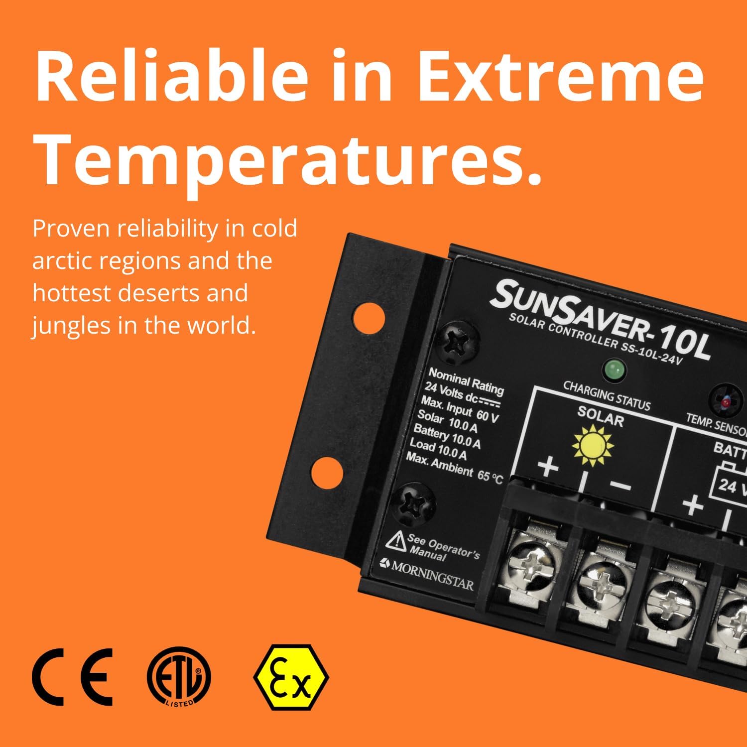 Morningstar SunSaver 10A PWM Solar Charge Controller (SS-10L-24V) – Solar Panel Regulator for 24V Batteries, Four Stage Battery Charging, LVD, HazLoc Rated, Low Noise, 5 Year WTY – Designed in the USA