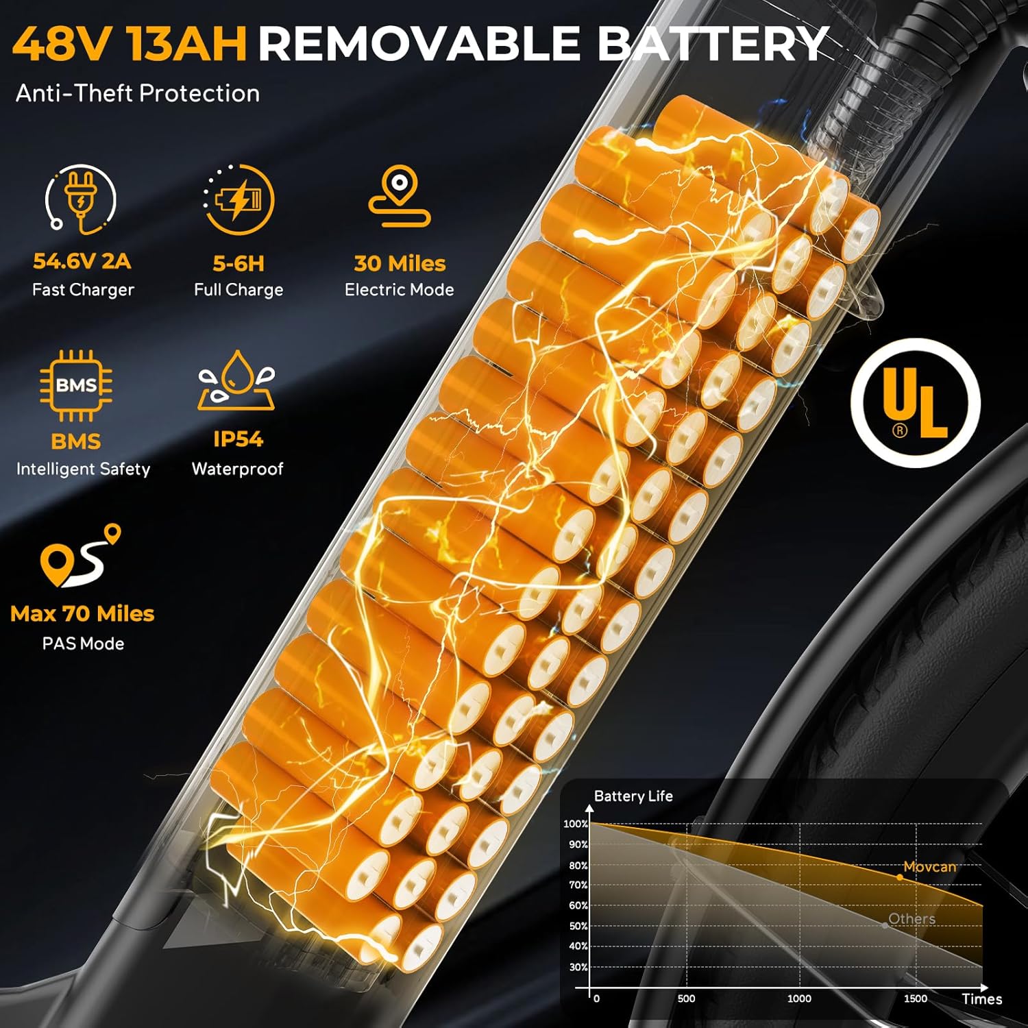 【Powerful 1000W Motor】Movcan V80 electric bike Built-in a 1000W(Peak 1500W)brushless hub motor, electric bike for adults can reach a top speed of 28MPH, robust motor delivering 80N.M torque, easily overcome 30° steep hills. You can enjoy a comfortable riding experience and powerful braking even on steep slopes, rugged terrain, or other extreme terrains.