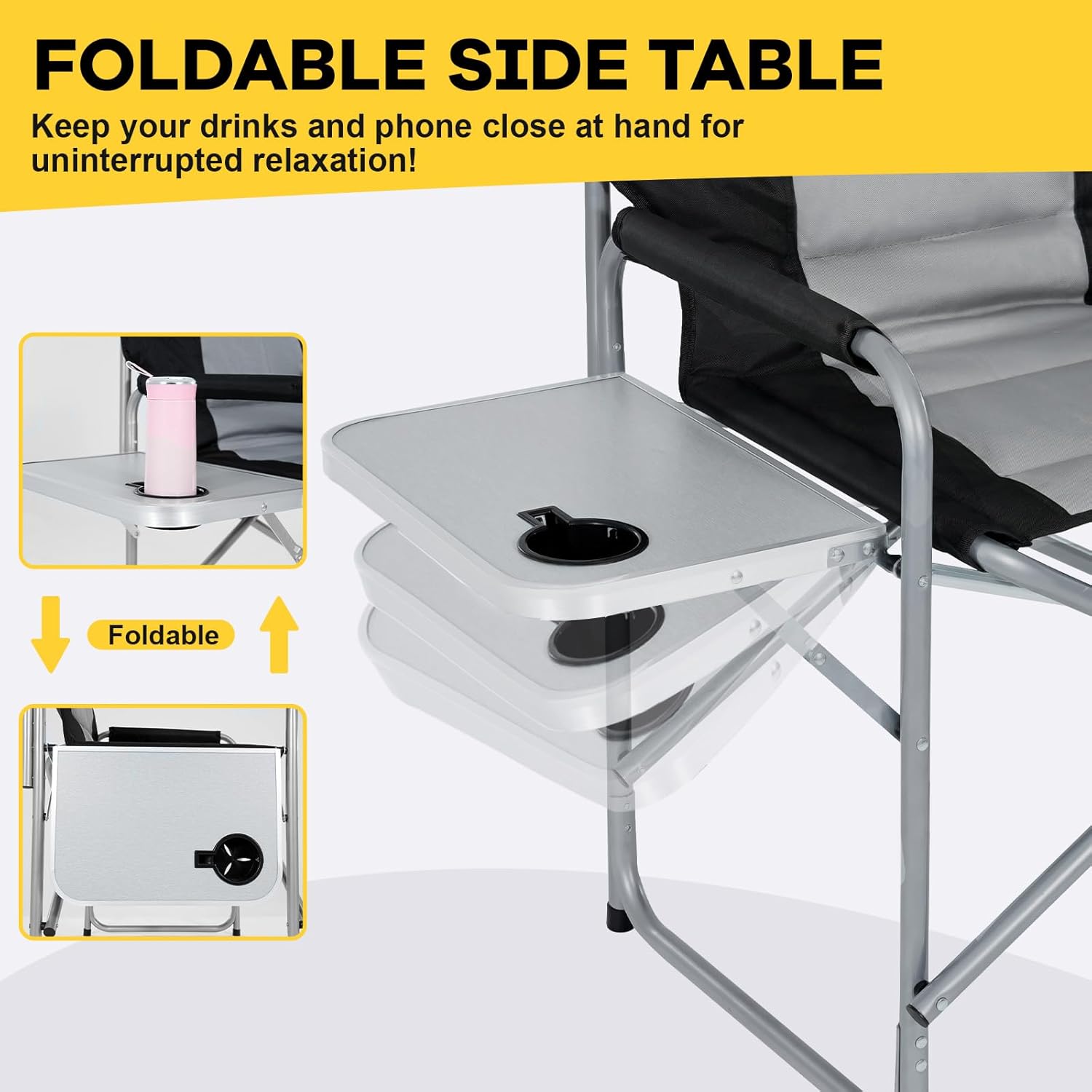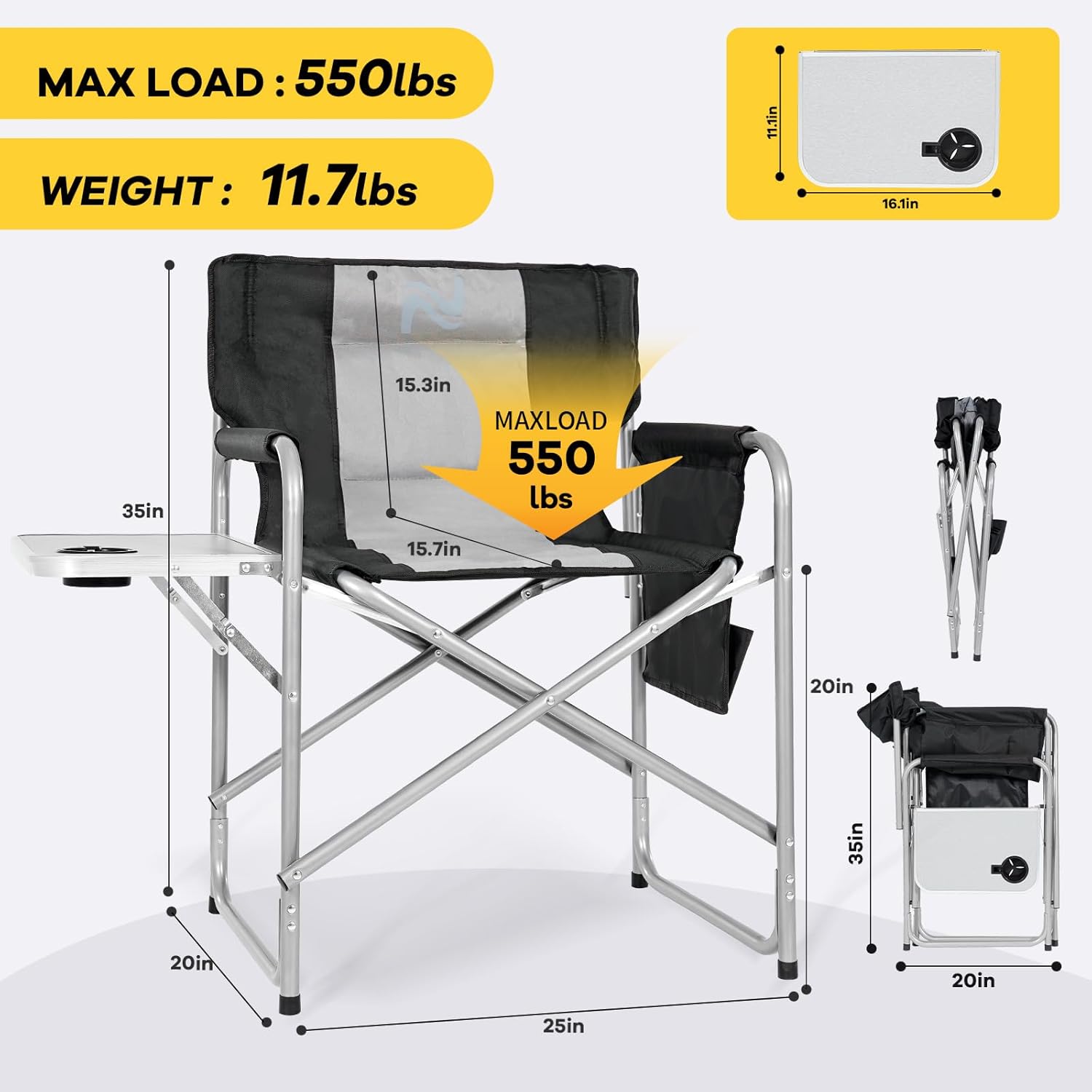 ROBUST & DURABLE FRAME:Crafted with a high-strength aluminum tube frame,our director chair supports up to 550 lbs. Its generous size of 25″ L x 20″ W x 35″ H ensures maximum comfort