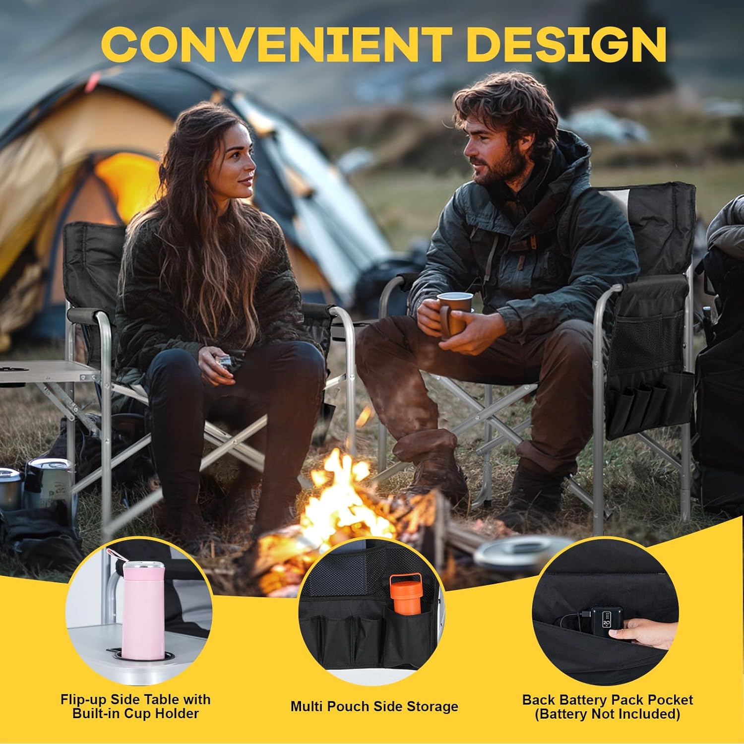 ULTIMATE HEATED DIRECTOR CHAIR:Upgrade your camping experience with our heated director chair, perfect for both warm and chilly days. Dual-zone heating in the back and seat reaches 131°F in just 10 seconds, offering three temperature settings (104°F, 113°F, 122°F)