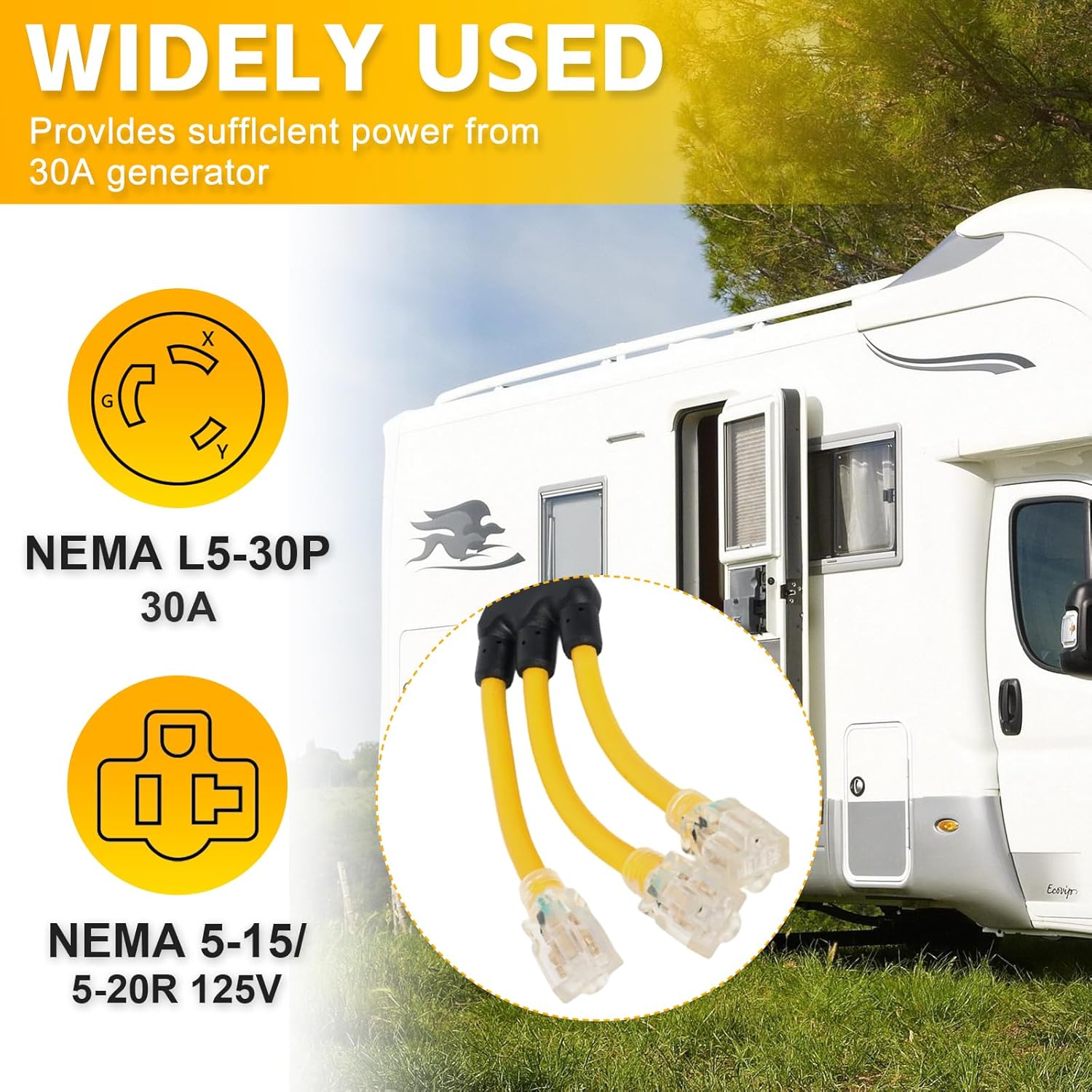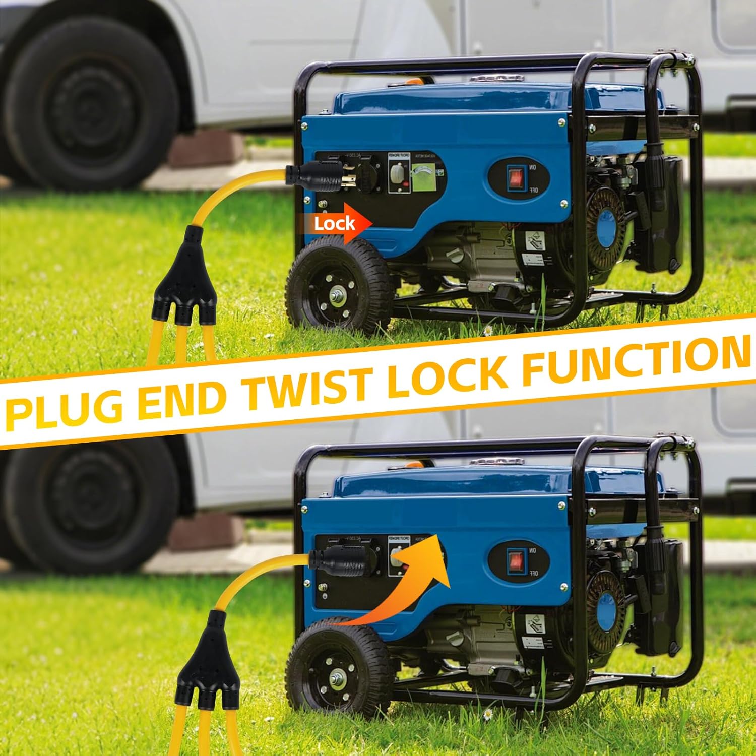 Generator Adapter: NEMA L5-30P to 5-15/5-20R adapter cable converts a 3-prong locking shore or generator power connector to 3 household common T-blade connector.
