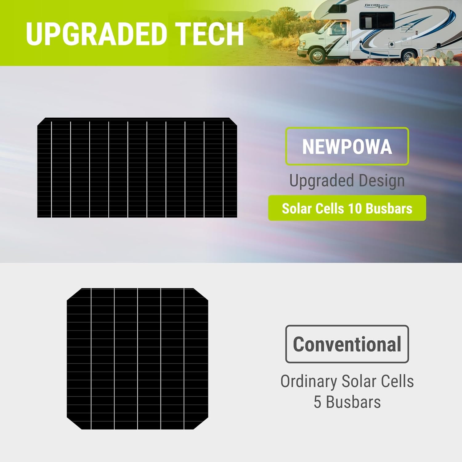 【10BB Cell Design】More Busbar, More Power. Newpowa 100W glass fiber flexible solar panel uses the high-level 10BB cell design with a 23% highest conversion rate. It makes the solar panel have a longer service life. Increase the cell receiving surface, a thinner ribbon reduces the covered area by 22%. Also, it can charge a 12V battery or a 24/48V battery by wiring several solar panels in series.
