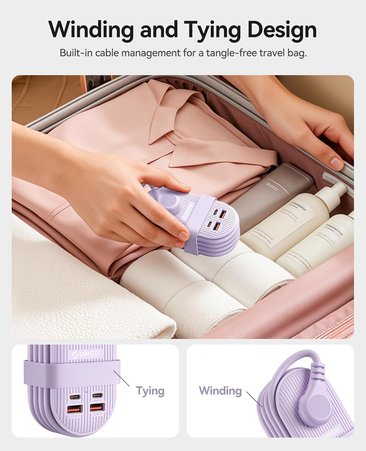 Winding and Tying Design: The design cleverly secures the extension cord to the product and comes with a dedicated strap, eliminating the problem of tangled wires. The overall appearance is simple and neat.Whether placed in a suitcase or a backpack, it won’t take up too much space.Its size is only 4.84x 2.28 x 1.61inch, Weight 10.19 OZ(Note: Due to high power, the weight may be slightly heavier)