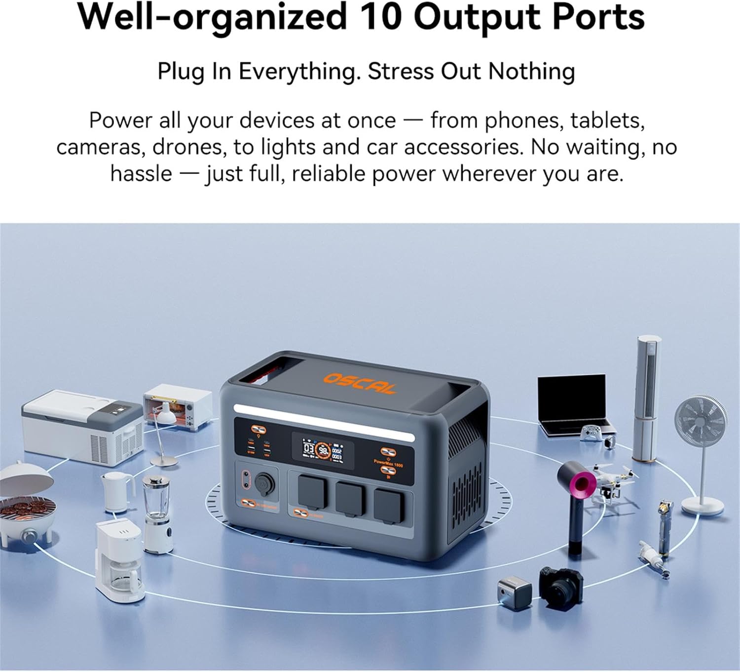 【Fast and Adjustable Charging】OSCAL PowerMax 1800 solar powered generator charge 0-80% in just 1 hour with 800W AC input. Solar full charging 800W(Max) in 1.5 hours. Super-fast charging speed, you can pair the portable solar power station with solar panels to harness endless sunlight and save your expenses.