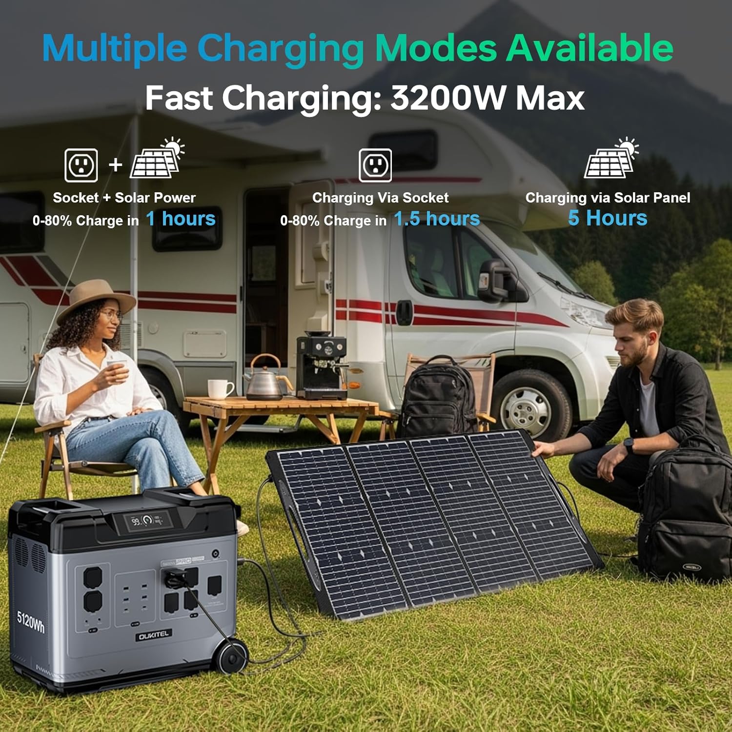 Ultra-Fast & Versatile Charging: Power up and go — Charge the OUKITEL P5000 PRO Generator from 0 to 80% in just 2h29min with AC Fast Charging(1800W MAXimum), or achieve a full charge in 3h40min. Solar charge in as few as 4h30min with 1000W Solar panels. Maximize speed with dual-input charging, which combines AC and solar (2800W total) for a full charge in just 2 hours, giving you the fastest, most flexible power solution for emergencies or adventures.