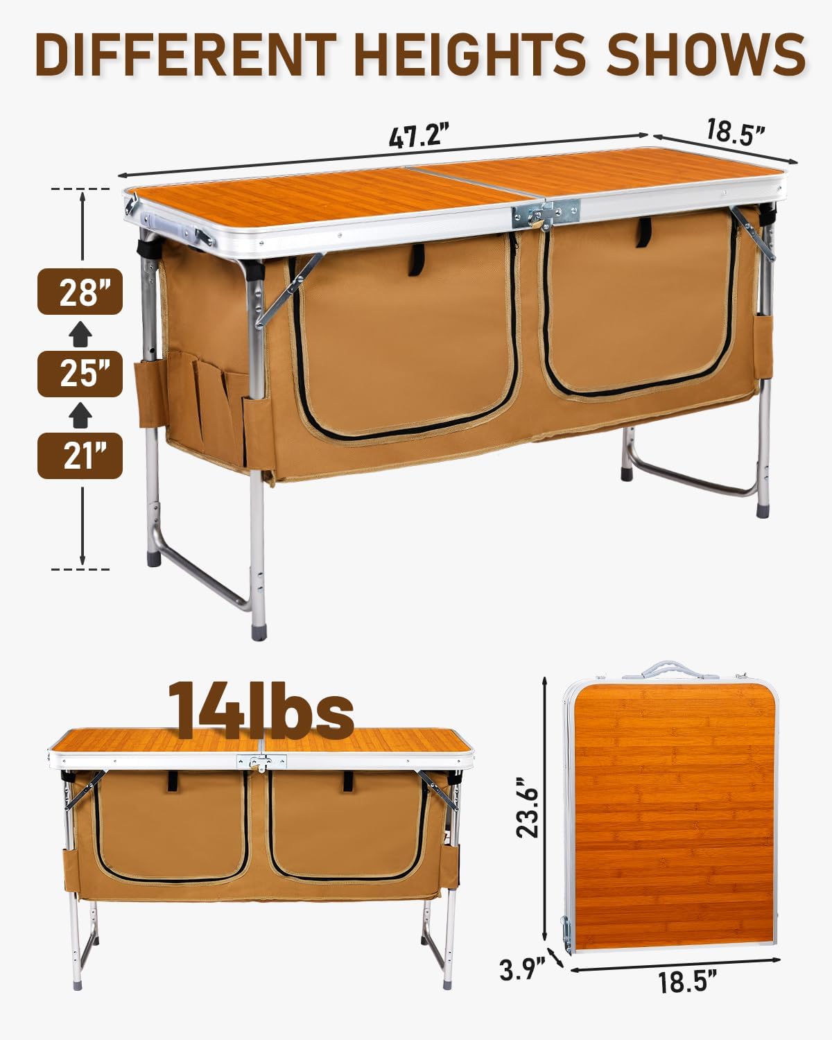 Compact Storage Solution: Weighing just 14 lbs. and folding down to a compact size of 23.7 Ă— 18.6 Ă— 4 inches, this table is ideal for easy storage in small spaces. Perfect for on-the-go lifestyles