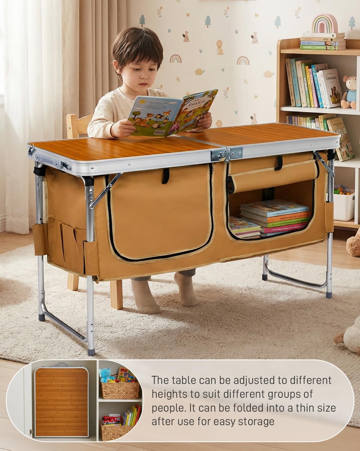 Spacious and Durable Design: Equipped with two large detachable storage bags underneath, our table keeps your essentials organized. Store drinks, snacks, keys, and more, ensuring outdoor snacking is both easy and mess-free