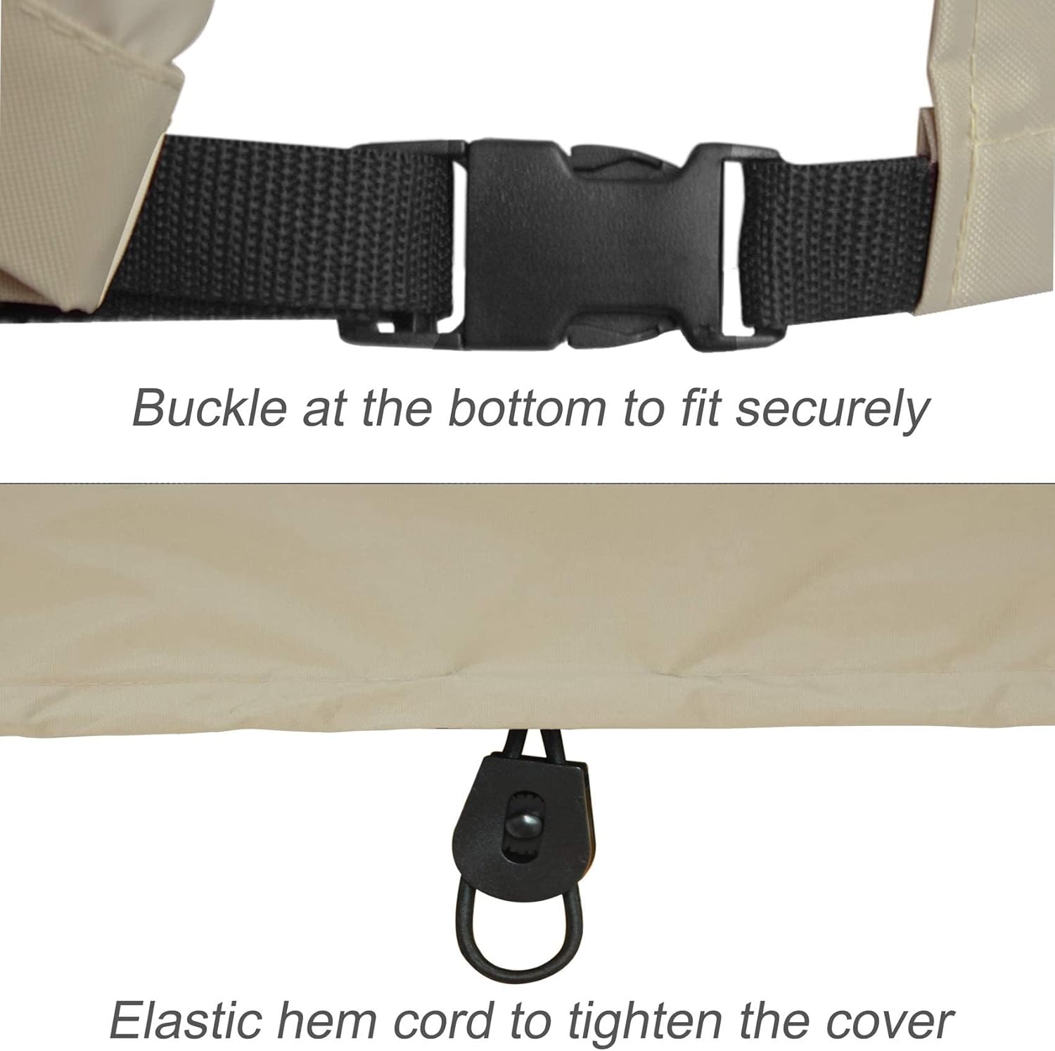 Close the buckle to prevent the opening from being blown away and adjust the elastic hem cord around the bottom to secure fit.
