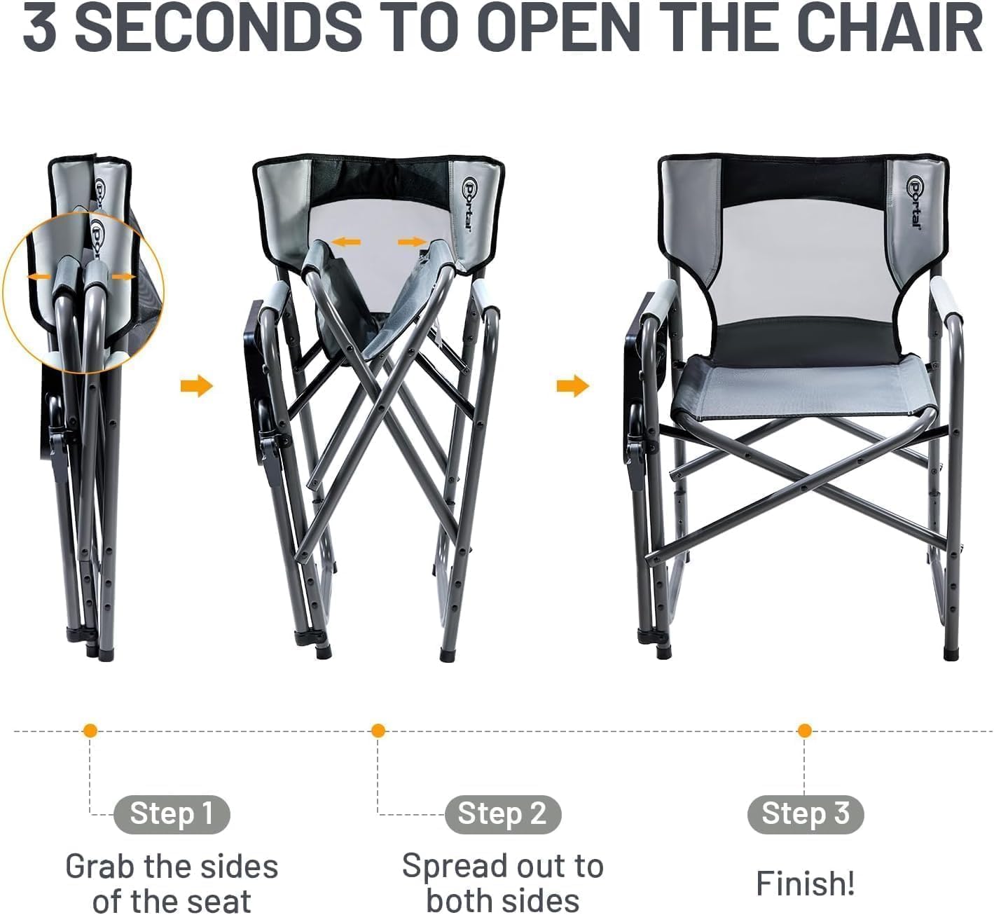 Have access to all your relaxation necessities with the Portal Max Comfort Director’s Chair. This chair is ideal for BBQs or picnics, a day of soothing reading at the park, or enjoying a meal on your hiking trips. Lean back in this comfortable seat with armrests, and flip up the swivel table to rest right in front of you. With ample room and an integrated cupholder, you can enjoy a messy BBQ meal, get lost in your book or reading tablet, or simply keep your refreshing drink in front of you while you bask in the glow of the campfire. This handy locking table is adjustable, so you can even keep your phone, drink, or other personal items right next to you and within reach and secure. Portable and lightweight, this director’s chair can be folded flat quickly for streamlined storage and transportation, and unfolds just as easily once you’ve claimed your ideal resting spot. Made to last through many outdoor excursions, this chair is built with a sturdy powder coated steel frame and 600D polyester fabric with 3D breathable mesh. With a 300 pound capacity, this hardy chair measures 22.4″ x 9.4″ x 36.2″ when folded flat, and 14.6″ x 17.9″ x 34.3″ when fully set up.