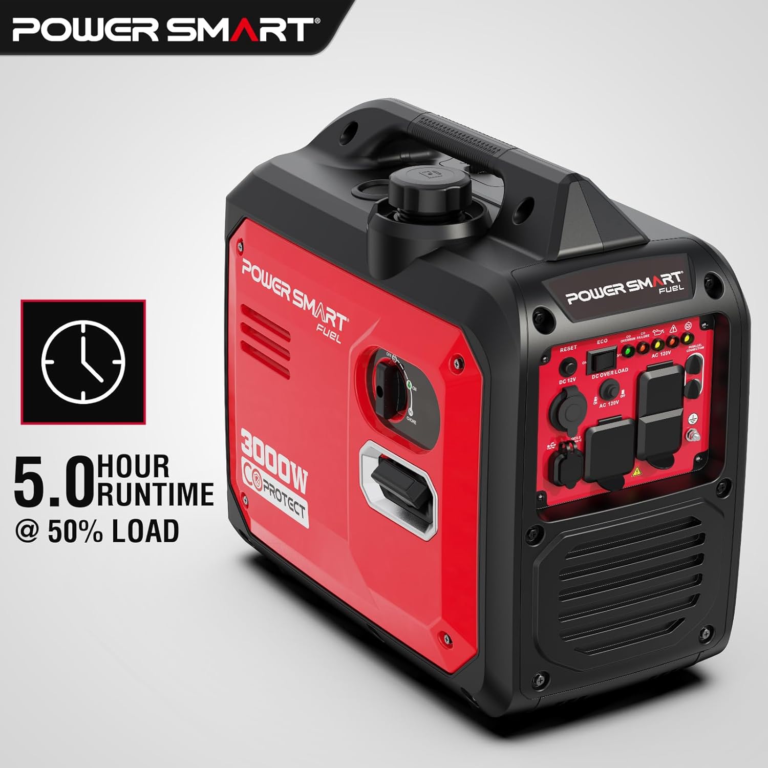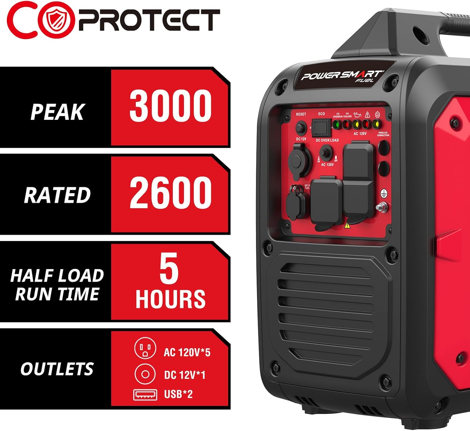 Power: 3000 starting watt and 2600 running watt clean power (less than 3% THD), 5 hours run time at 50% load