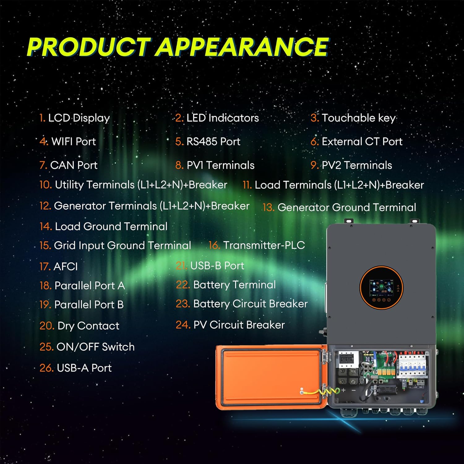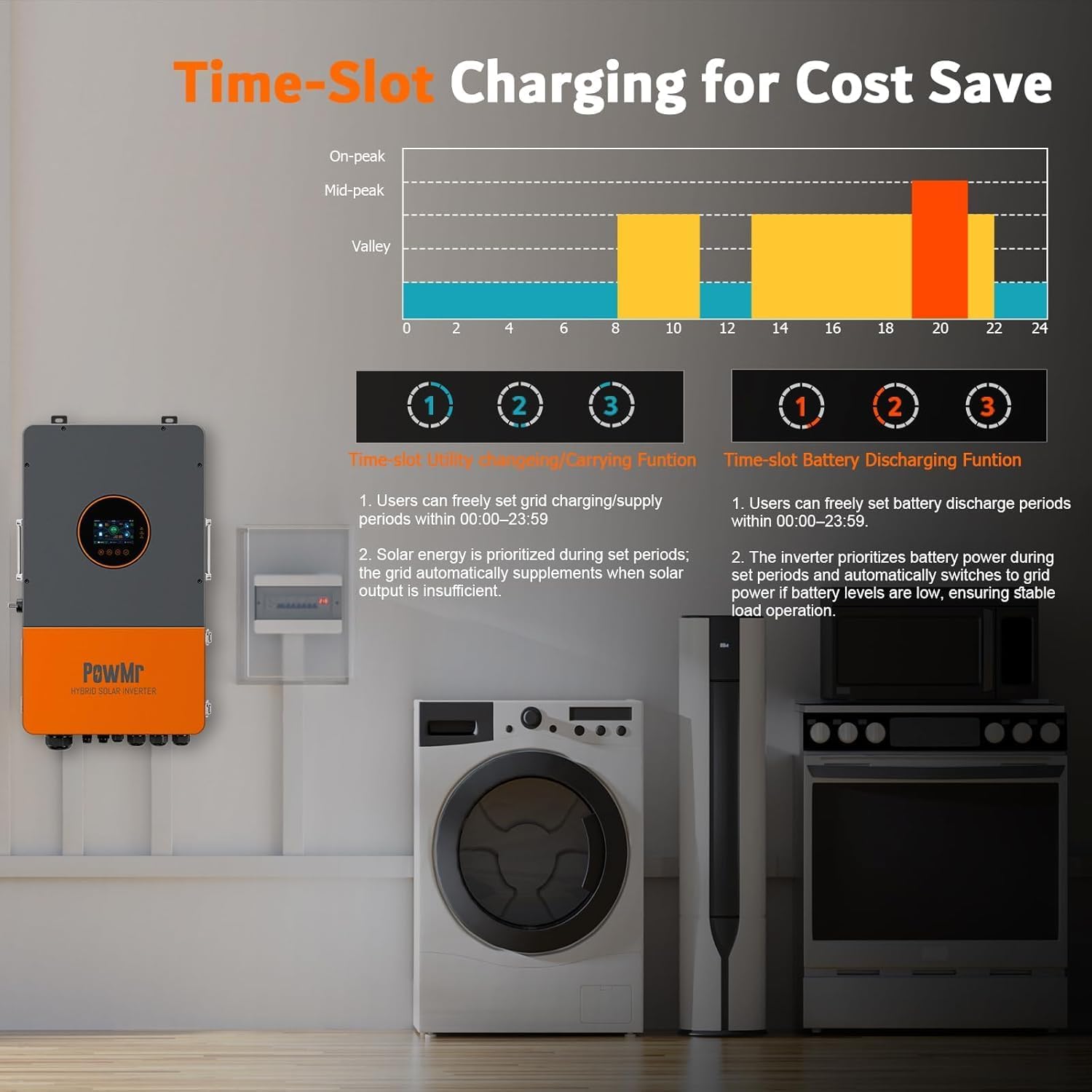 【Intelligent Energy Management & Scalable Home‑to‑Commercial Power】Program inverter to run on solar/battery during peak rates & grid‑charge when cheap—cut electricity bills. Works with Li‑ion or Lead‑Acid batteries; dual‑wake function revives dormant lithium via grid or solar. Single unit delivers full‑home 120V/240V split‑phase power—runs large appliances & HVAC without extra units, saving space and cost. Need more? Parallel up to 6 units into 3‑phase system (max 60 kW) for large homes or commercial use; scalable as needs grow, no full replacement needed