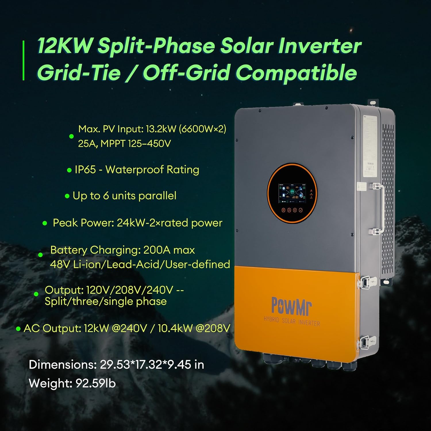 PowMr 12000W Solar Inverter 48V to 120V/240V, UL1741/CSA/IEEE1547, Off/On-Grid Split-Phase Hybrid Inverter w/Touchscreen, 200A MPPT Controller, Can Sell Surplus to Grid, 48V Li/Lead Acid Compatible
