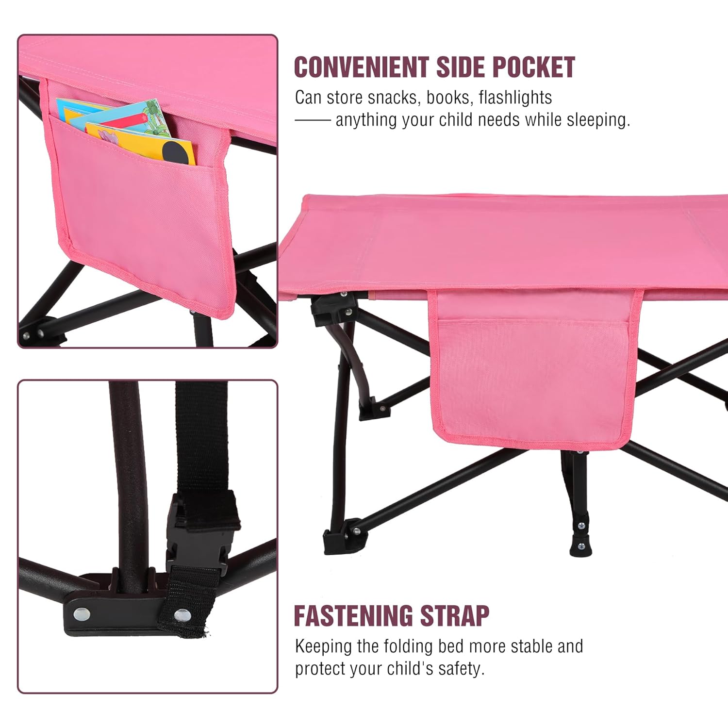 REDCAMP Kids Foldable Camping Cot with Mattress Pad, 220 LBS Child Durable Sleeping Bed with Pocket and Carry Bag Portable for Home, Travelling, Pink