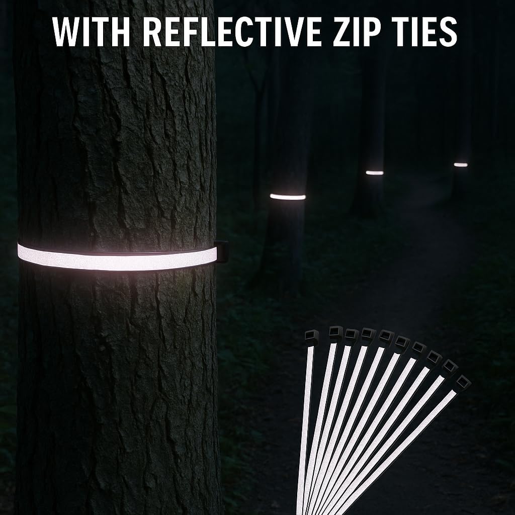 Reflective Cable Ties – Heavy-Duty, UV Resistant & Weatherproof Light the Way. Lock it Down. Stay Safe. Whether you’re deep in the woods, running at dawn, working on a jobsite, or keeping pets secure, our reflective cable ties combine the strength you need with built-in visibility for safety and convenience. Designed from heavy-duty nylon 66 with UV resistance and all-weather durability, they’ll hold strong in sun, rain, snow, and heat—while helping you spot your gear instantly in low light. ⸻ Why Outdoorsmen Love Them Secure tarps, lash gear to your pack, mark your tent lines, or tag your trail spots. Reflective surfaces make it easy to find camp after dark and keep your setup safe from trips or tangles. Essential for Hikers Bundle trekking poles, keep gear organized, and mark trails for visibility. Perfect for sunrise starts and sunset returns when light is limited. Runner Safety Upgrade Attach to running belts, shoes, or backpacks for an extra pop of reflective visibility during early-morning or night runs. Pet Owners’ New Best Friend Secure fencing, repair leashes, or mark pet tie-out areas. Great for late-night dog walks—reflective strips make gear visible to you and passing drivers. Contractor-Grade Toughness Bundle cables, secure conduit, or fasten temporary barriers. Reflective coating keeps work areas visible at night for added safety compliance.