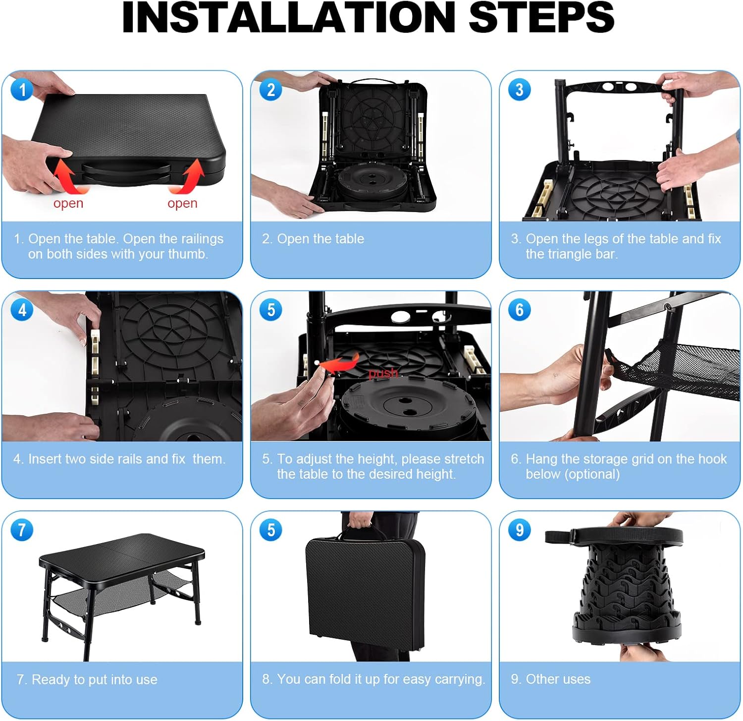 Height Adjustable & Multifunction: Table height can be easily adjusted by pressing the knob between 11.50in, 15.75in, 17.72in and 19.69in. The stool can also be adjusted within the range of 2.36 to 18.11 inches,both adults and children can easily adjust to the most comfortable height according to their needs.Benefitting from it, the collapsible table and chairs can meet various occasions as camping table, travel table, beach tables for sand foldable, bed table tray etc. Make it very easy to transform between indoor and outdoor use