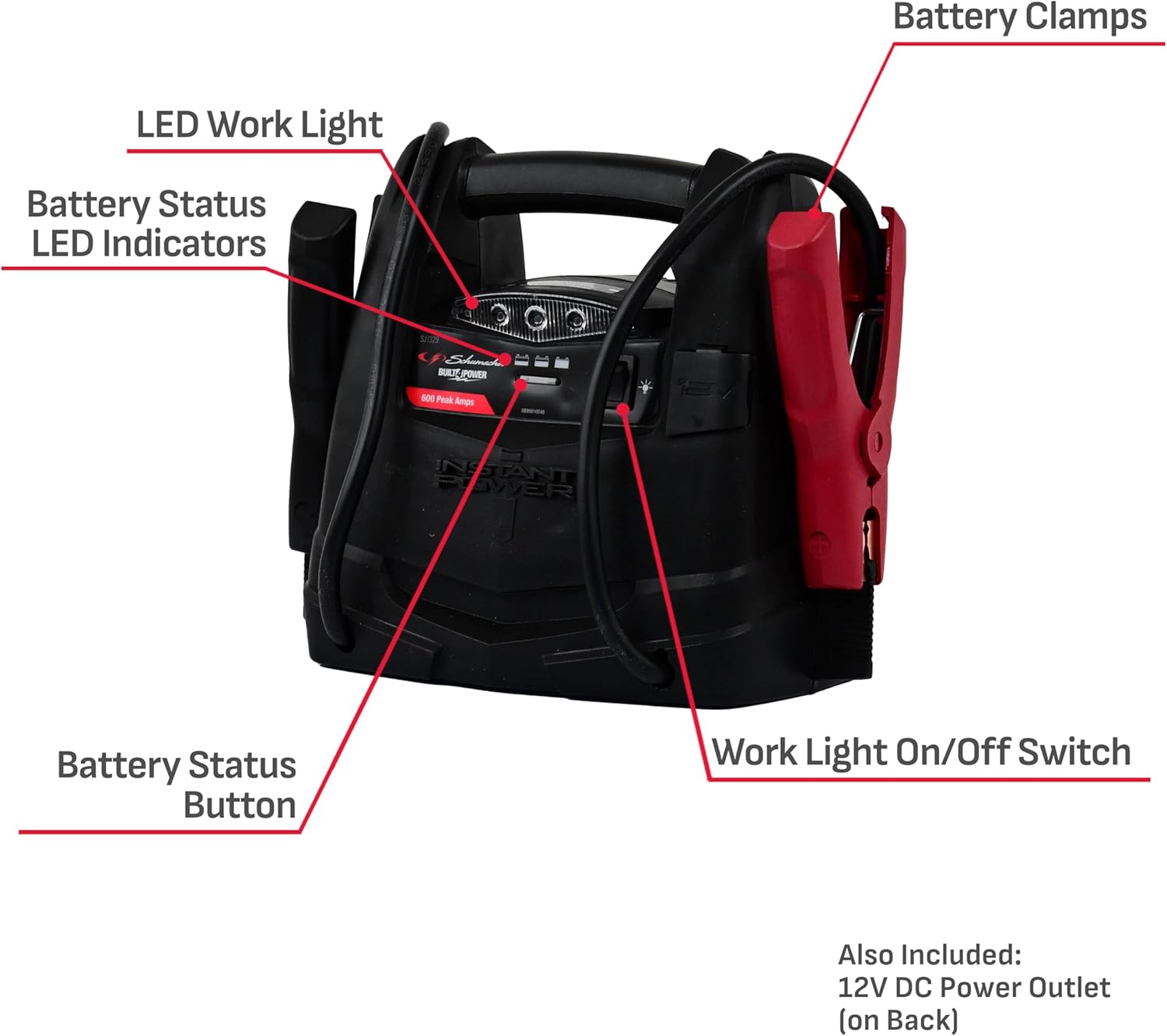 Introducing the ultimate roadside companion: the Schumacher Electric SJ1329 3-in-1 Portable Jump Starter and Power Station, delivering 600 peak amps for instant jump starts. Engineered for reliability, this versatile device packs emergency jump starter power, a 12V DC outlet for charging or running accessories, and an ultra-bright LED work light all in one compact unit. Designed for wide compatibility, it works seamlessly with most cars, trucks, SUVs, ATVs, motorcycles, and marine vehicles—making it the perfect portable power solution whether you’re at home or on the road.