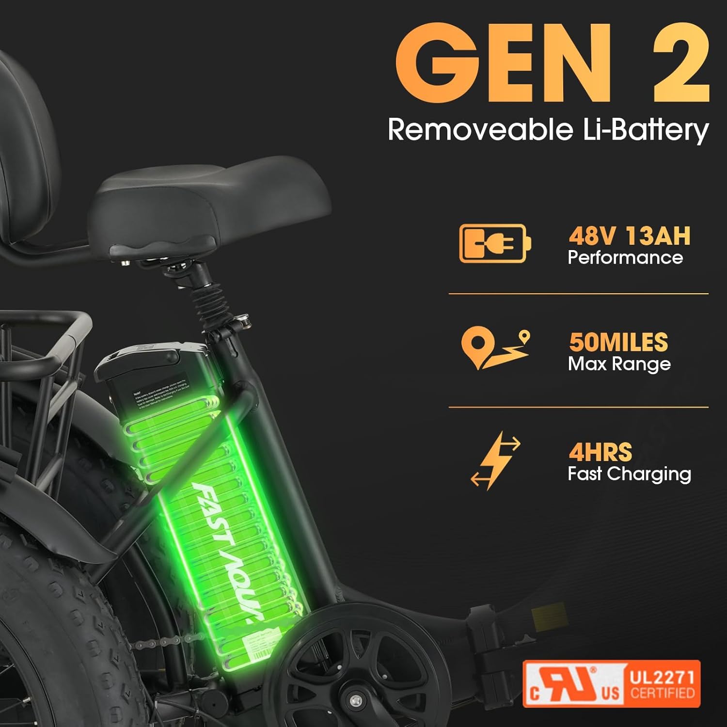 Long-Lasting and Certified Safe Removable Battery – Go the distance with a UL Certified 48V 13Ah battery. This electric bike for adults can achieve up to 50 miles in PAS mode on a single charge, offering seniors the freedom to visit friends, run errands, and enjoy leisurely outings without range anxiety.