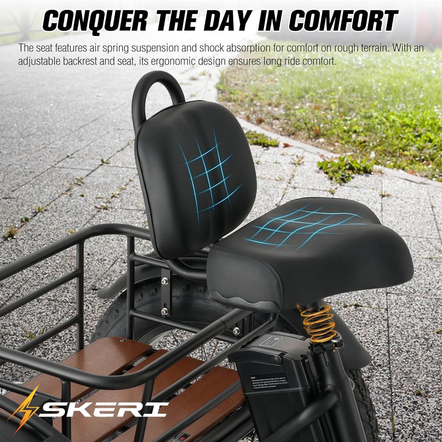 Skeri Electric Trike for Adults: Stability, Power & Freedom, Simplified Redefine your ride with the Skeri Electric Trike: The ultimate 3-wheel electric bike engineered for unwavering stability, robust power, and everyday freedom. Perfect for seniors, commuters, adventurers, or anyone seeking a secure, versatile electric trike for adults. Conquer city streets, rugged trails, or steep hills with confidence on this intelligently designed adult tricycle. Why Choose the Skeri E-Trike? Unstoppable Power & Support: Tackle 20% inclines and any terrain effortlessly with a powerful 750W rear hub motor (1350W peak!), housed in a durable aluminum frame. Experience true peace of mind with responsive 24/7 customer support, a 24-month warranty, and easy setup (90% pre-assembled). This etrike for adults is built for reliability and backed like no other. Go Farther, Ride Safer: Venture further with confidence thanks to the high-capacity, UL Certified 48V 13Ah removable battery, delivering an exceptional up to 80 miles per charge. This folding electric trike meets the highest safety standards for worry-free adventures wherever you roam. All-Terrain Confidence & All-Day Comfort: Master snow, sand, gravel, or bumpy roads on rugged 20″x4″ fat tires. Enjoy unparalleled comfort with the adjustable wide saddle and supportive backrest, reducing strain on your back and hips. Tailor your journey with multiple riding modes and monitor everything on the intuitive LCD display. This adult 3 wheel bike is built for exploration without compromise. Smart Storage, Effortless Portability: Maximize urban living with the space-saving folding aluminum frame. Store it easily in apartments, car trunks, or garages in seconds. Ample cargo capacity is guaranteed with upgraded front and rear baskets plus a sturdy rear rack. This foldable tricycle blends utility with ultimate convenience for errands, shopping, or getaways. Corner Like Never Before: Advanced Stability: Experience superior maneuverability and confidence on turns with our innovative rear differential system, allowing each wheel to rotate independently. Combined with hydraulic disc brakes and a low center of gravity, this electric trike for adults ensures a stable, secure ride on varied terrain and inclines – ideal for seniors, riders seeking extra balance, or those carrying cargo. Built for Every Adventure: Lightweight yet incredibly sturdy, the Skeri electric tricycle features a supportive ergonomic design ready for all-day rides. Whether you’re replacing car trips, exploring trails, running errands, or simply enjoying the outdoors, this foldable electric trike delivers eco-conscious freedom without sacrificing performance or practicality. Conquer Terrain. Command Comfort. Choose Skeri .