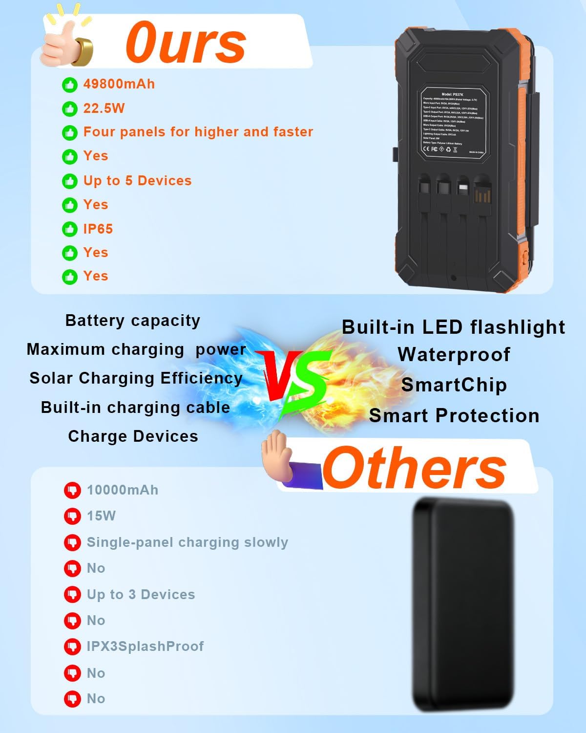 🔋 High Capacity and Safe and Reliable Power Bank:49800mAh ultra-large capacity solar charger that can keep your phone running all day. Built-in high-quality lithium polymer battery, the battery pack has passed UL, CE, FCC, RoHS, and UN38.3 certifications. Powerful safety system provides temperature protection, overvoltage protection, overcurrent protection, short circuit protection, etc. The Solar Power Bank stabilizes the device and ensures its safe use.