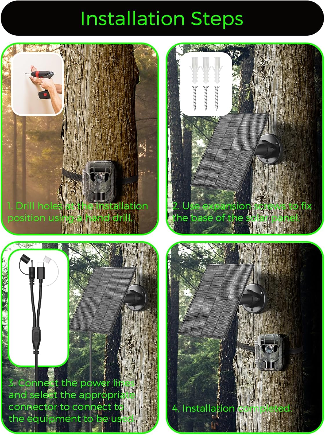 【Easy to Install】This trail camera solar panel comes with an installation kit and pre-drilled holes on the back and bottom, allowing you to mount and secure your hunting camera solar panel in under 5 minutes