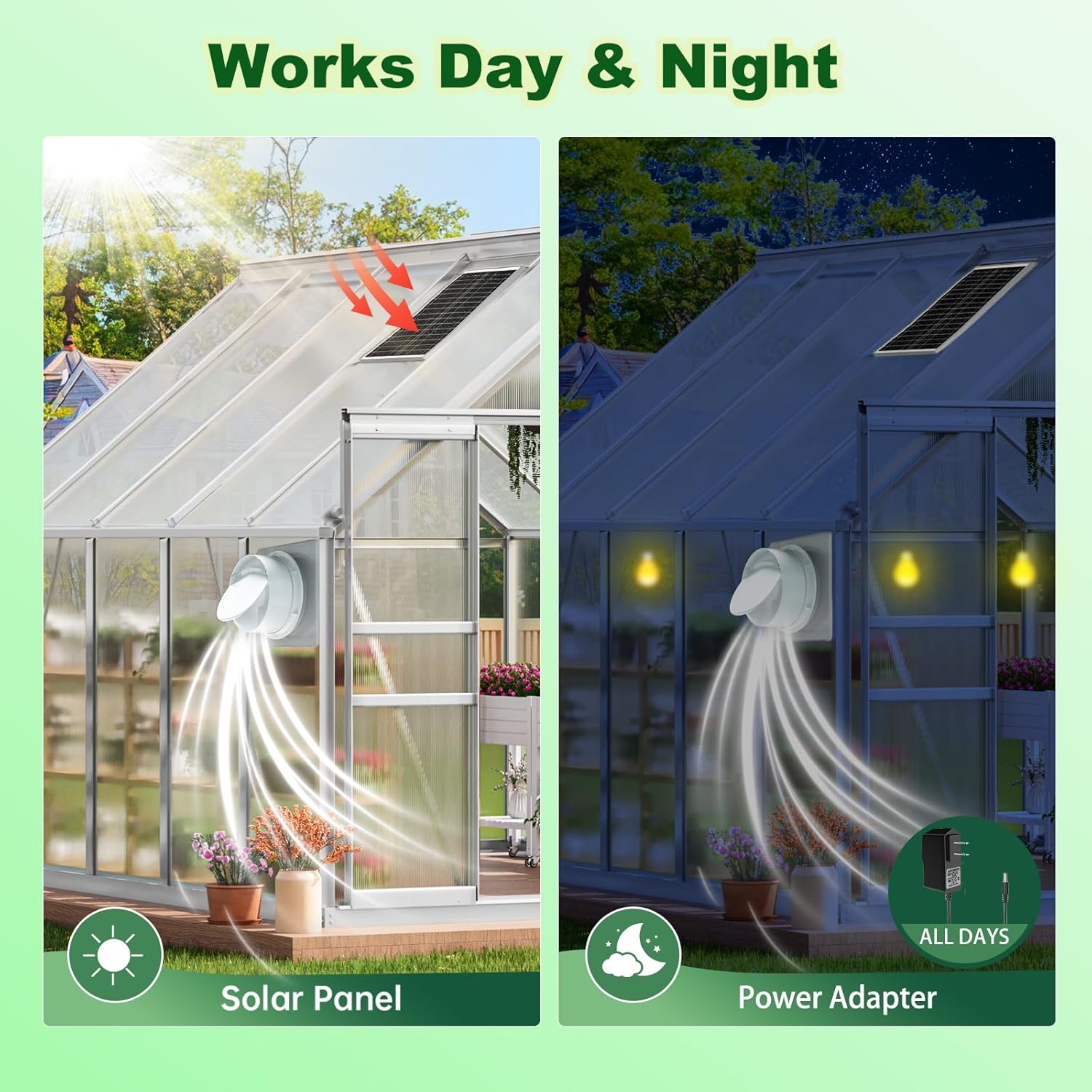 【Also Work in Cloudy Day and Night】Binwacool Solar Fan Equipped with a 25W high-efficiency solar panel and a power adapter.so that the solar powered fan can not only used on sunny days, but also on cloudy, rainy days, even at night. The fan can effectively discharge hot air, draw in cold air, lower the indoor temperature, and maintain fresh air circulation in all day.