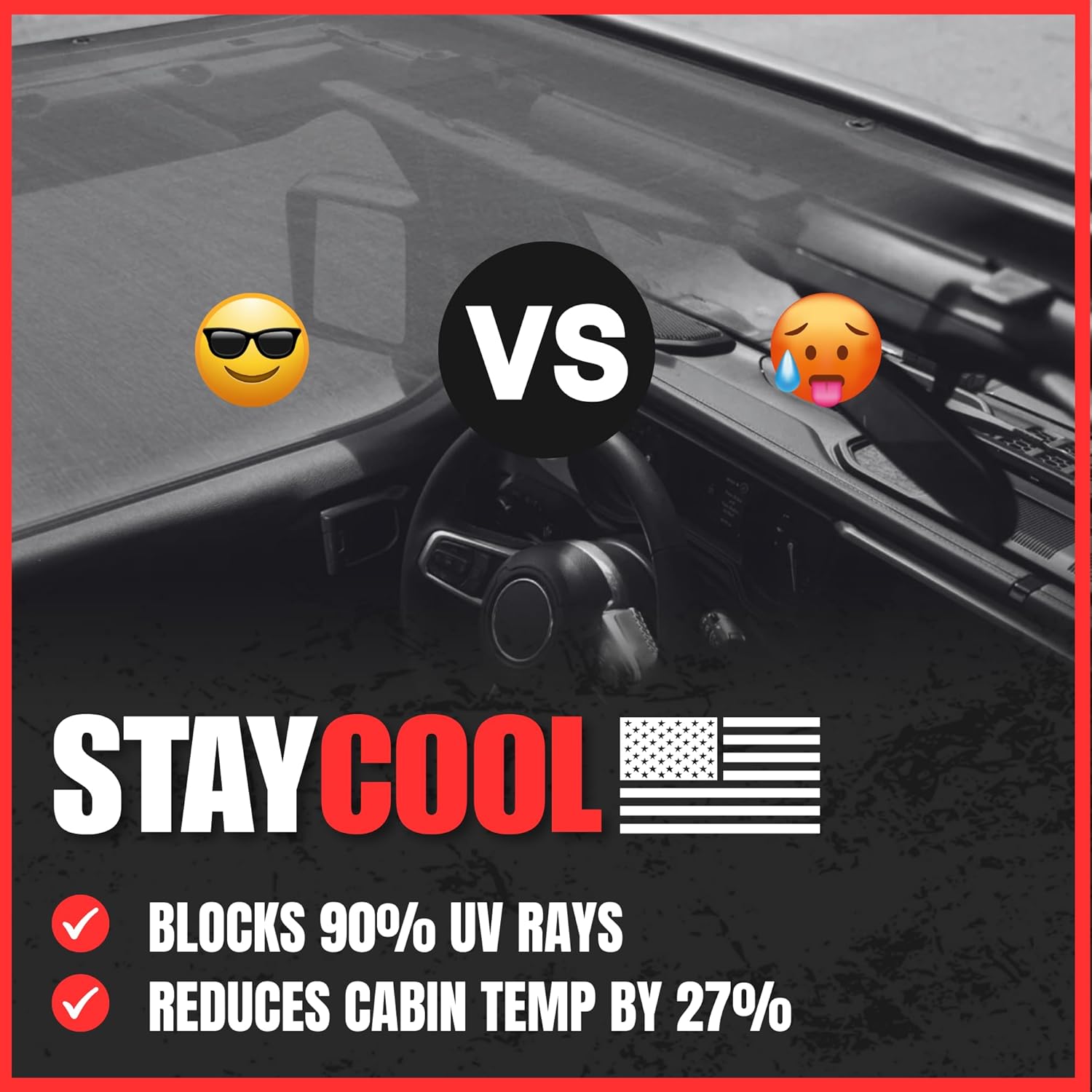 PROTECTION FROM THE SUN: SPIDERWEBSHADE delivers that unbeatable top-down freedom on your Jeep, letting you soak in the breeze and views without the sting of sunburns or sweltering heat—its unique trailmesh design filters out 90% of intense sunlight and drops cabin temps by 27%, so your 2007-2017 Wrangler JK 2-Door remains a cool haven for all your rugged outings.